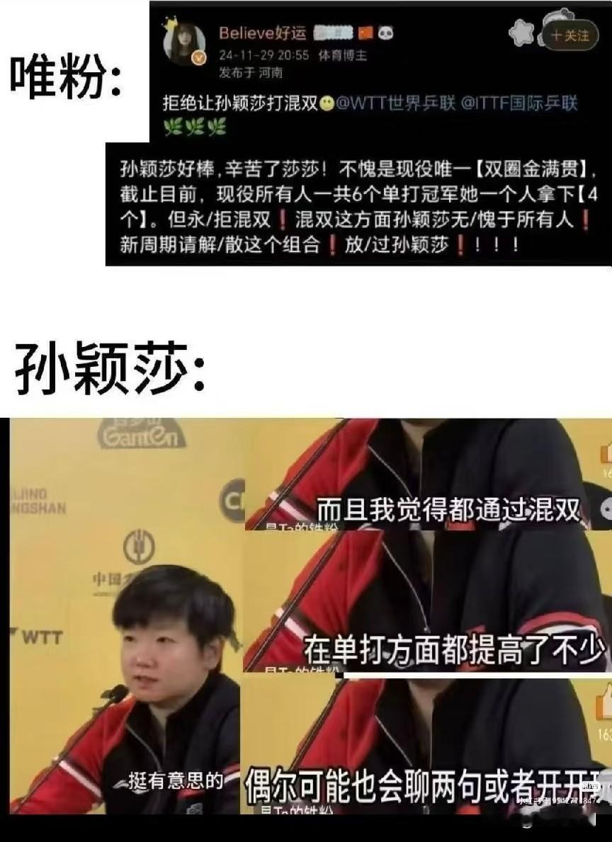 天哪!两小只混双城市宣传照真是美得不像话![比心][比心][比心] 官方的排版还是最懂人心的!毕竟是金主爸爸和妈妈(卖票) 小咪:打混双还挺有意思的! 耶耶:保持和莎莎的同频和理解! 小王说过的,运动员有自己选择参加什么比赛的权利! 我也相信他俩选择打混双肯定是都自愿打的, 他们现在的地位我不相信一点话语权没有,至少教练都会征求他们意见的! 反正尊重他俩意愿,他俩打啥我就看啥! 别人都无权指手画脚的! 话说回来,唯粉指手画脚有用吗??