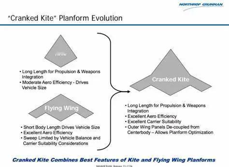 🔻如果在飞翼的基础上,要追求更长更大的弹舱以及航程,采用曲柄风筝构型是更合适的选择。