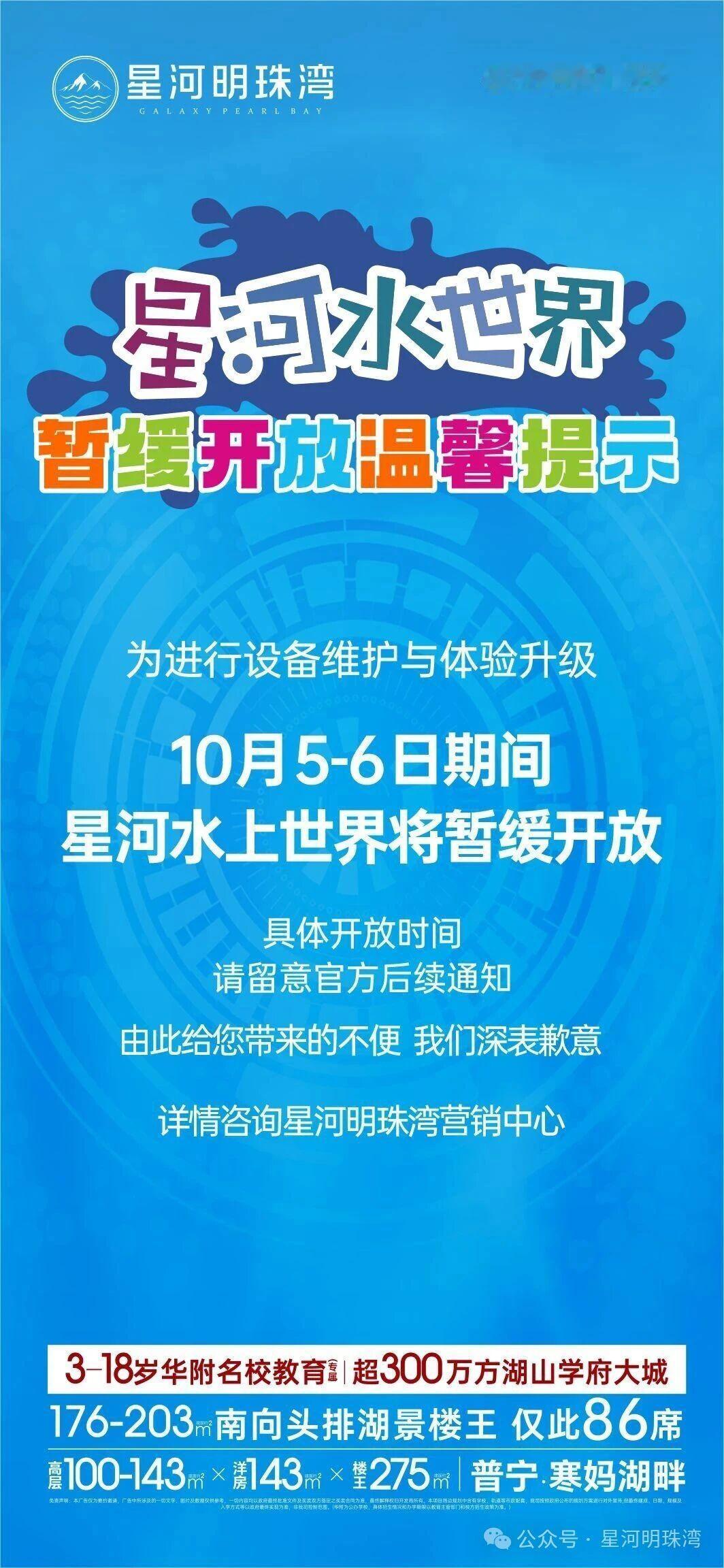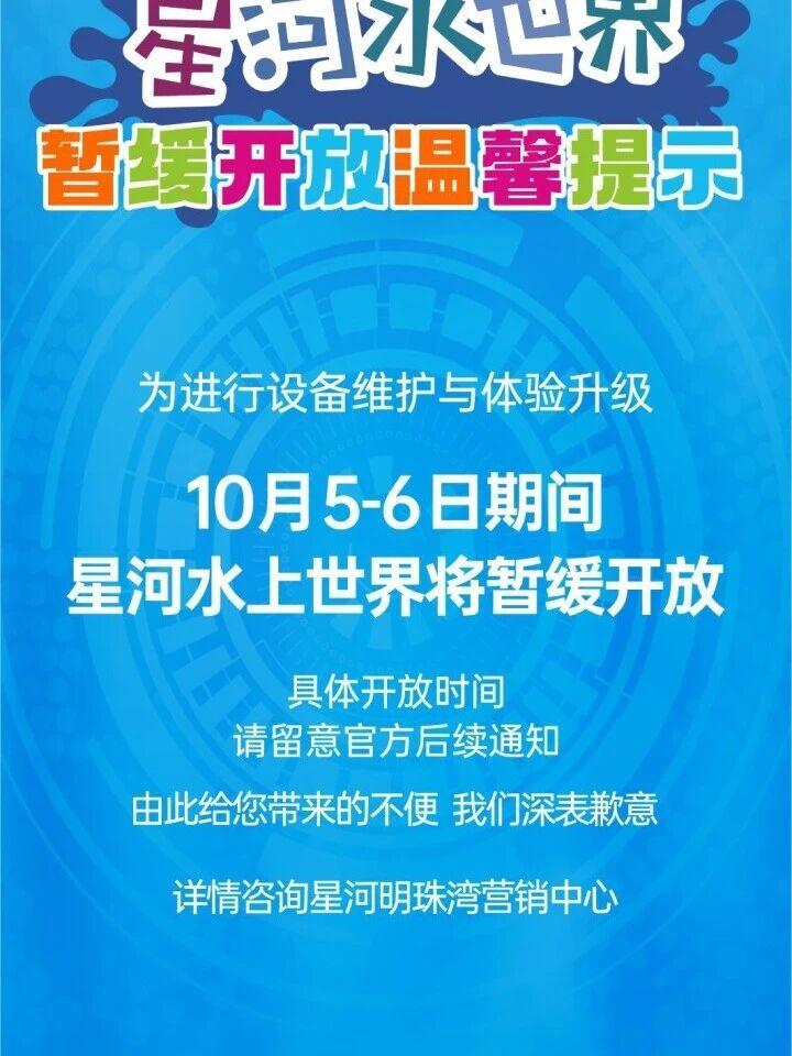 星河水世界暂停开放提示 因设备维护与体验升级,10月5-6日星河水世界暂不开放,具体开放时间留意官方通知,给大家带来不便深表歉意。
