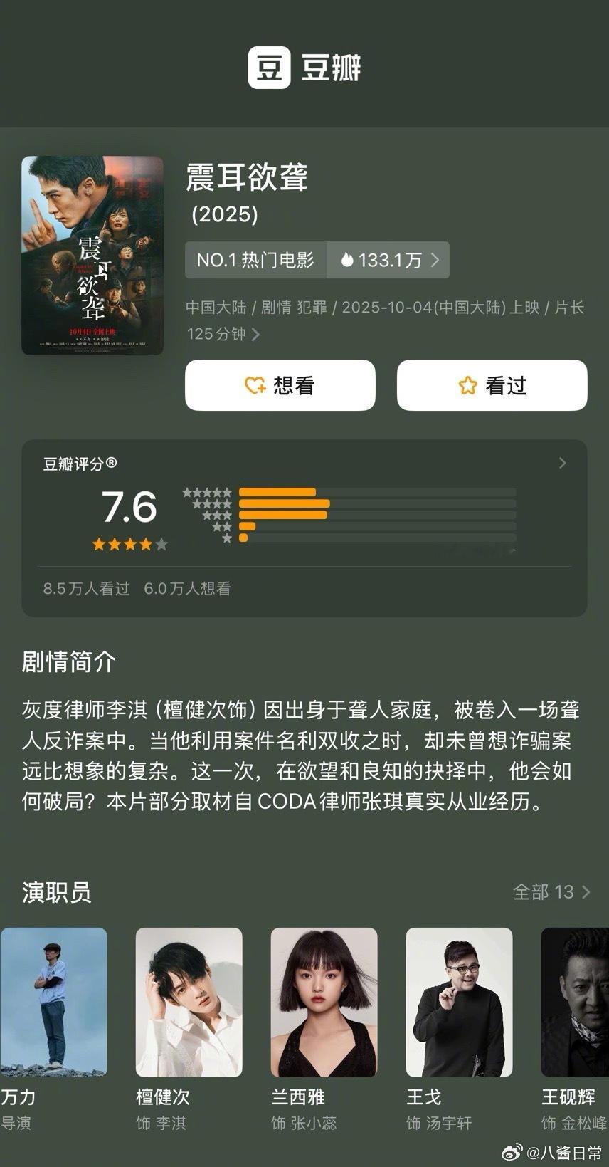 檀健次《震耳欲聋》豆瓣开分7.6分
