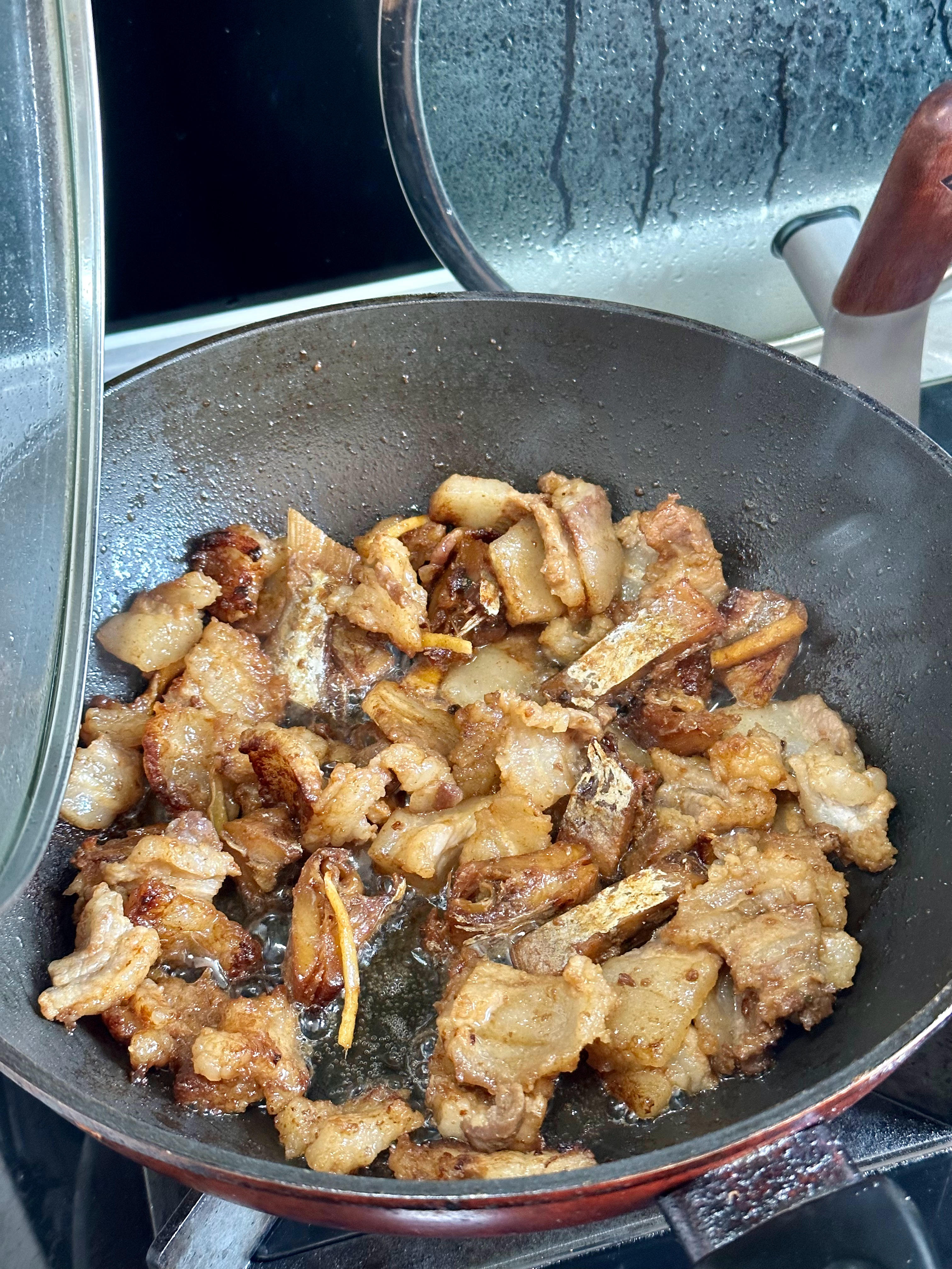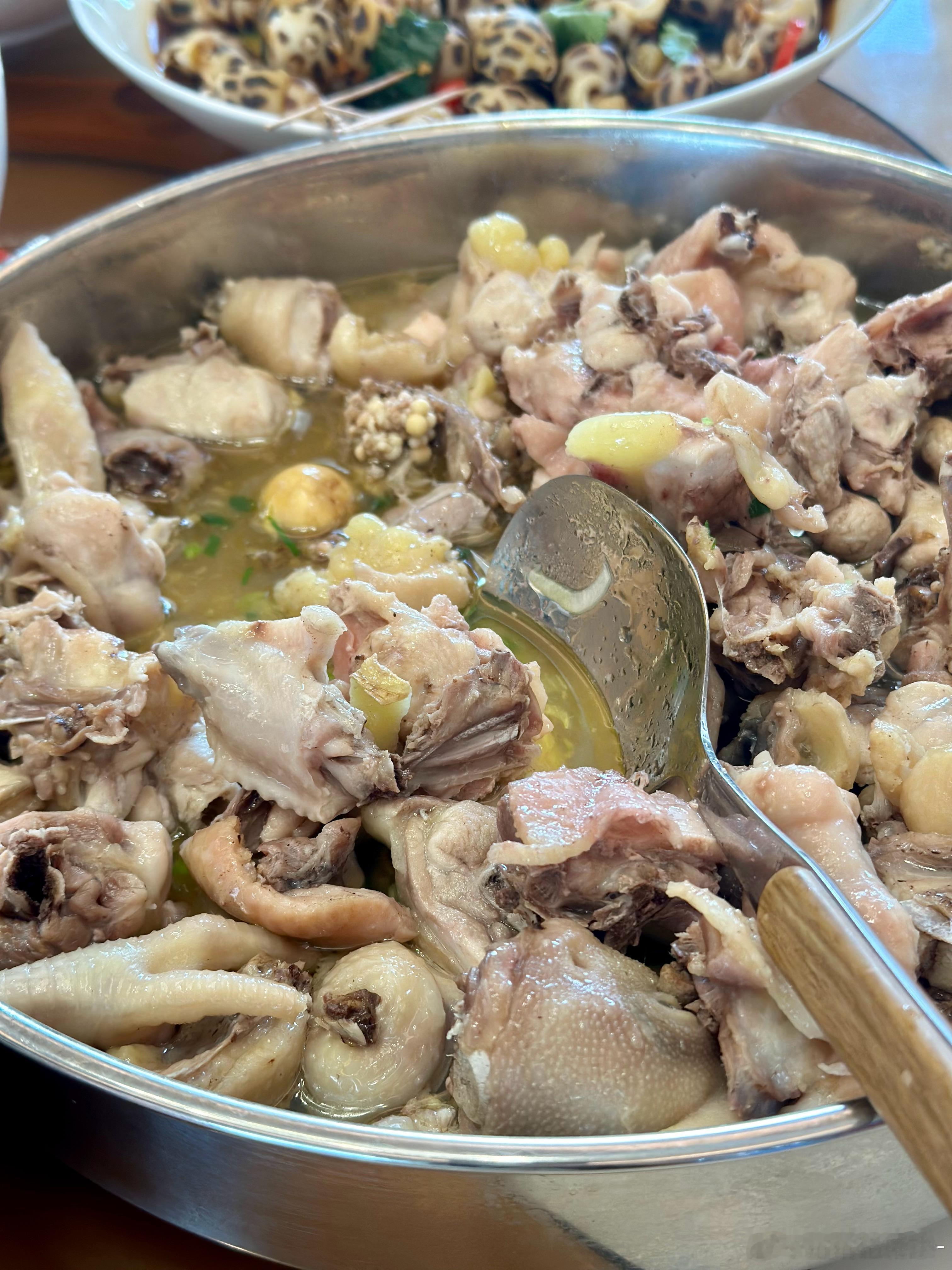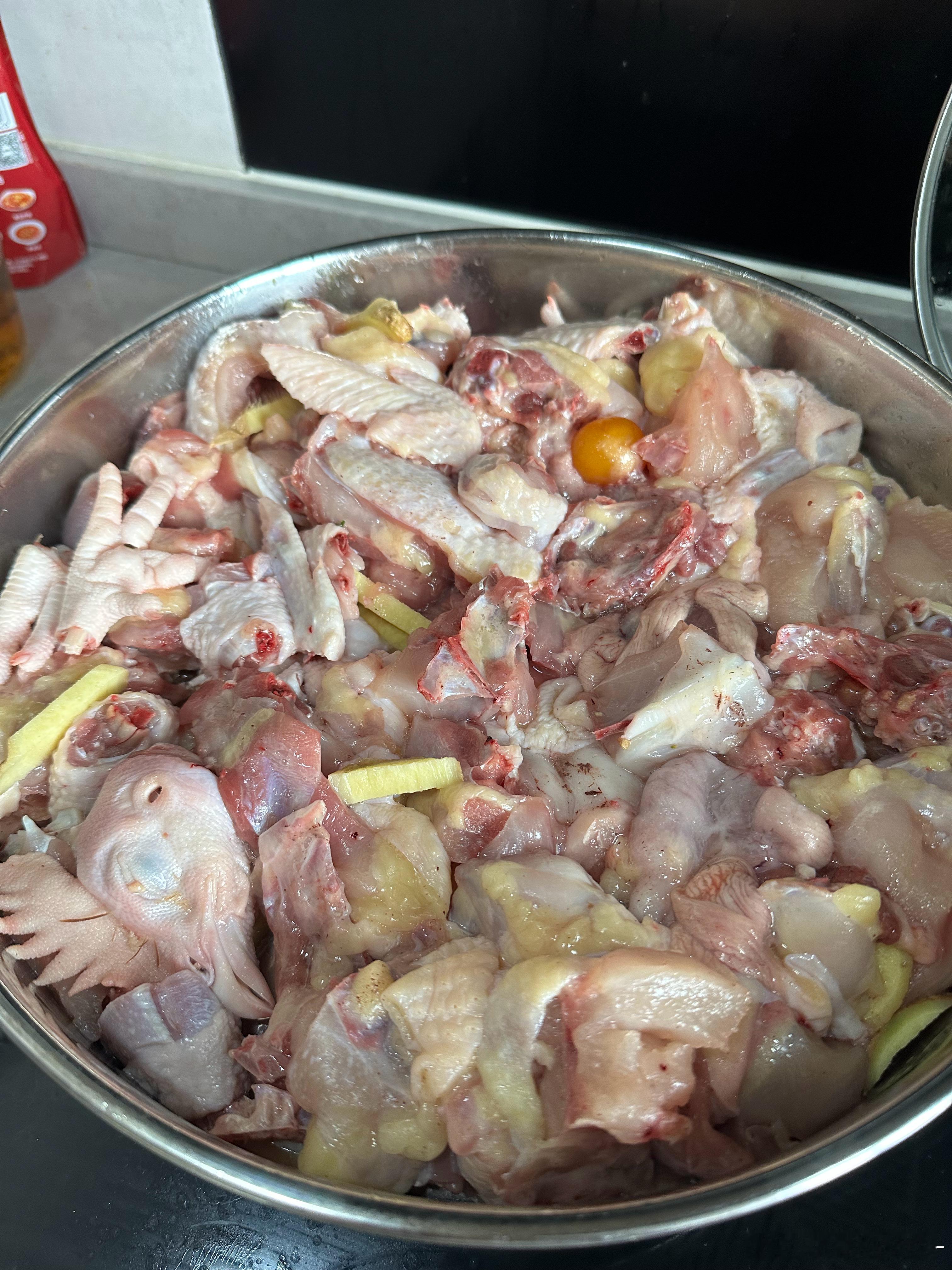 今天做了几道菜:干逼姜丝咸鱼花腩/隔水蒸胡须鸡/凉拌芥末花螺。唯一就是省时间把原本盐葱烤牛肉的方子一起清蒸了!
