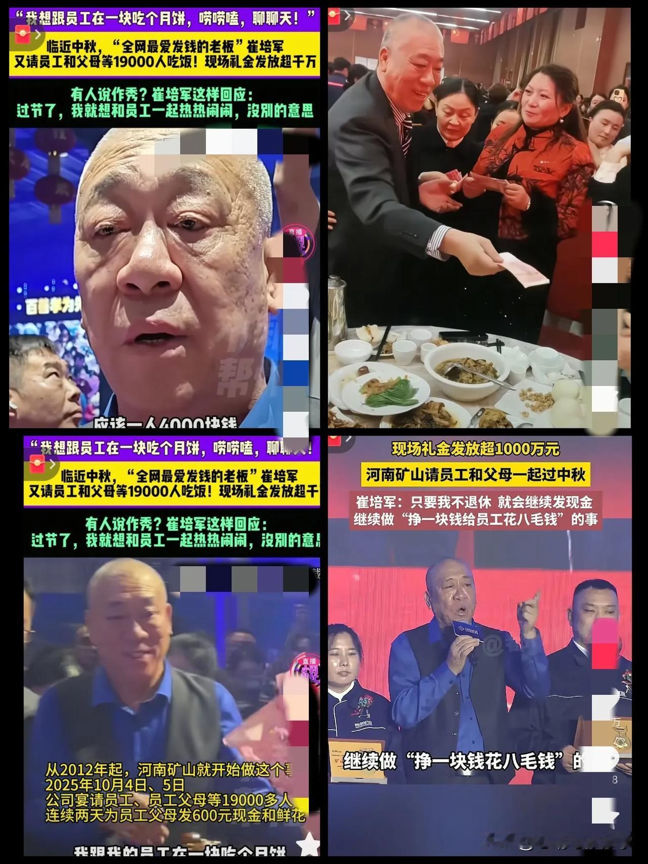 这个叫崔培军的河南汉子给所有企业家上了一课, 不是因为他很有钱,也不是因为他长的帅, 而是因为他已经连续十三年举办“中秋孝文化节”,给每位员工父母包600元红包送鲜花了,累计发放金额已经超过一亿元! 作为一个身价百亿的企业家,每年都会给自家员工的父母包红包送祝福,惦记自家员工的家庭,这一做就是十三年,看似简单的事,能坚持这么久的人,还真的少之又少! 把员工当成自己的家人,员工的父母当做自己的父母,员工的事就是自己的事,这一点,相信很多企业家都很难做到,而他却连续做了十三年! 也一直贯彻,公司赚一块,分员工八毛! 这么有大爱的企业家,还有谁不爱呢? 大家觉得呢?