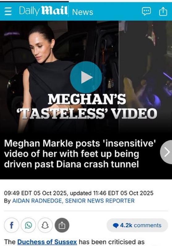 据梅根发型师丹尼尔及其同伴爆料,梅根·马克尔对《每日邮报》的报道怒不可遏。事实上,她已经联系了律师,律师已向每日邮报发出了法律通知。 近日,梅根分享了一段视频,视频中她乘坐豪华轿车,双脚翘起,经过戴安娜王妃遭遇车祸的隧道附近。这段视频被批评为麻木不仁而遭到强烈反对,因为1997 年戴安娜王妃就是在这条隧道中遭遇车祸身亡的。 我告诉过你们,这个标题会让她很生气。这让她很生气!! 但是,她上演了这一切,发布了这一切,享受了关注,现在当事情没有像她希望的那样发生时,她想扮演受害者。 戴安娜王妃在这条隧道遭遇惨烈车祸,她竟然在车里拍摄了自己,还假装自己是受害者?真的让人无法理解。