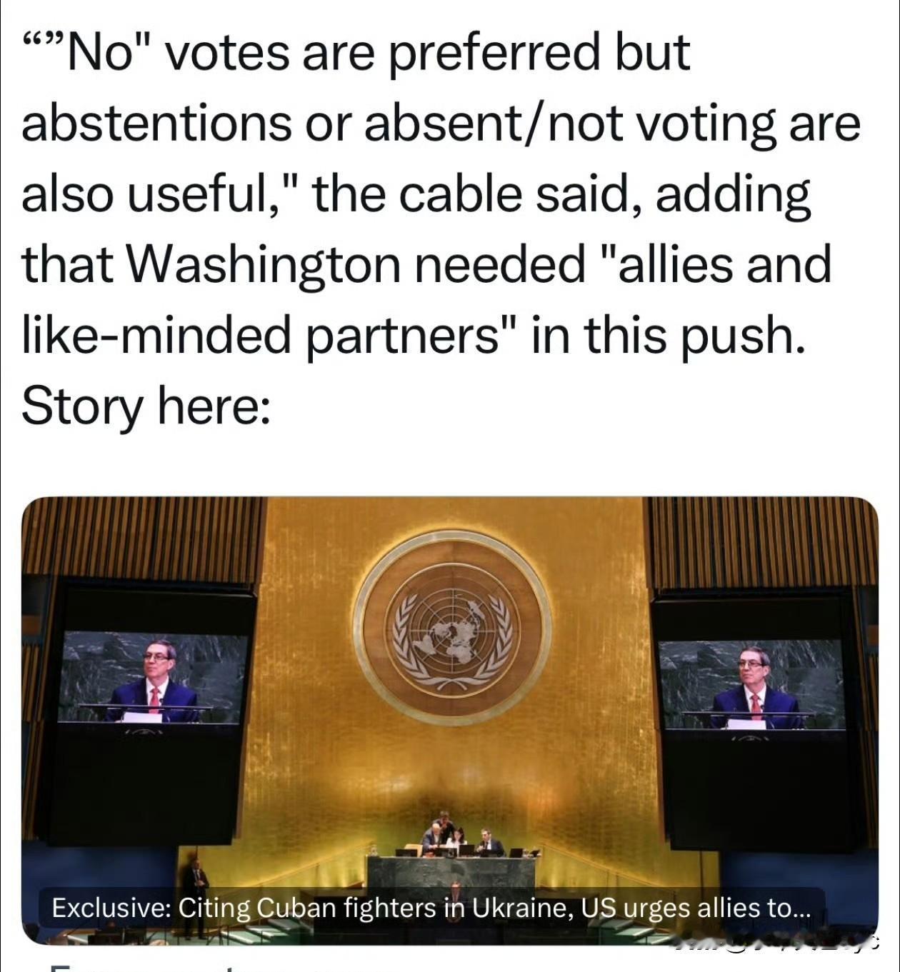 美国国务院指示驻外使节:尽量说服各国,不要同意取消对古巴的制裁,最好投No,弃权或缺席也可以…告诉各国,古巴在积极帮助俄入侵乌克兰,已派五千人。 美国对古巴已经实施了长达六十多年的封锁,但这一政策在联合国大会上每年都遭到压倒性多数的反对。美国此举的直接目标,就是在今年遭遇空前孤立的情况下,通过游说,尽可能地减少支持取消制裁的国家,哪怕是让它们弃权或缺席,也能削弱“反封锁”阵营的声势和合法性。这显示了美国即便在孤立状态下,也要全力阻止古巴在国际上获得任何喘息空间。 这是美国精心设计的一场针对古巴的外交围猎,美国正利用其在乌克兰危机中的道德高地和对国际舆论的影响力,对古巴发起新一轮的孤立行动,试图扭转在古巴问题上长期被动的外交局面。 欲加之罪何患无辞,美国不也是正在向乌克兰提供武器? 以色列在加沙的屠杀,美国装聋作哑,暗中支持,没有美国的参与支持,以色列敢这样有恃无恐?