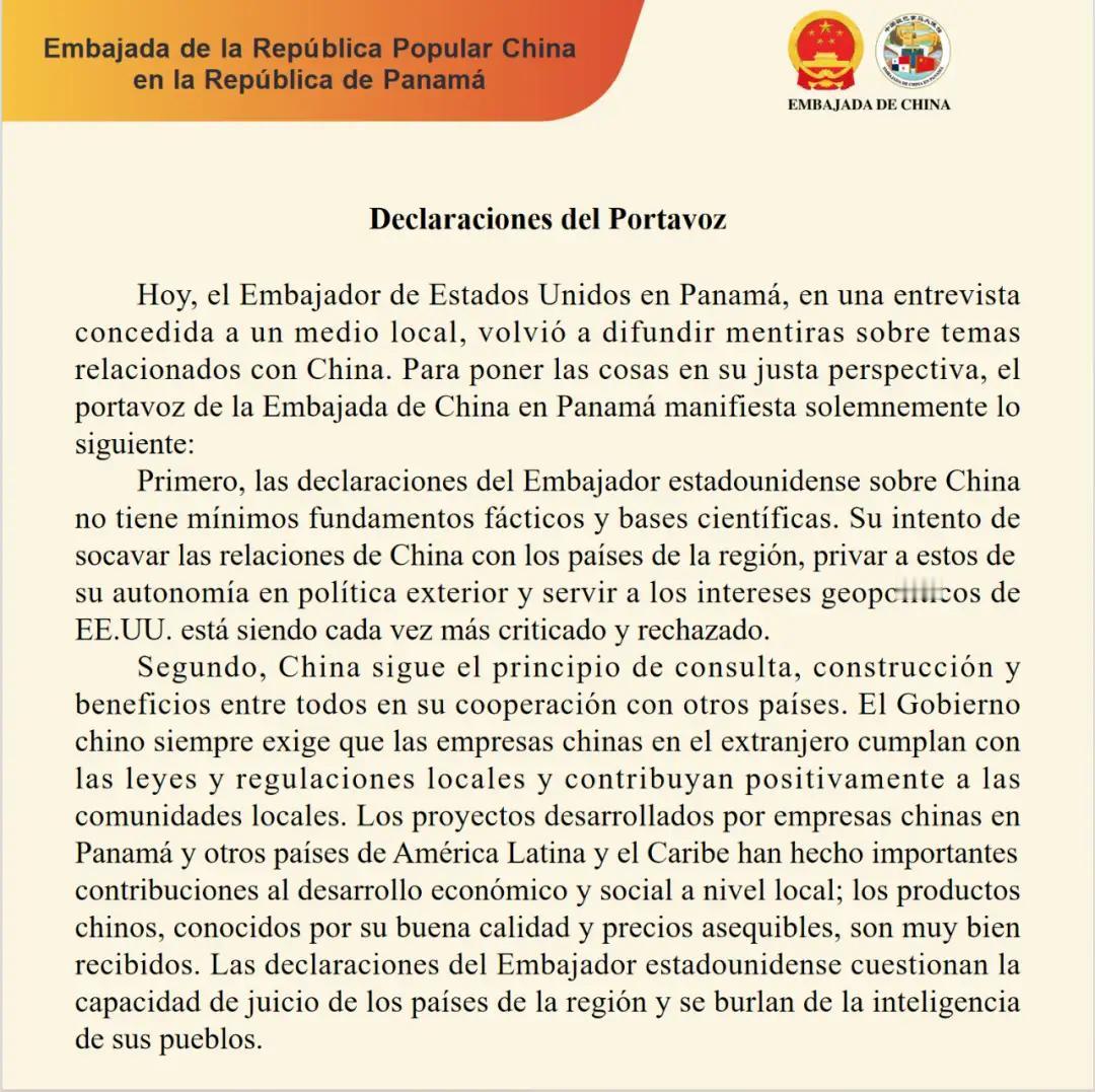 美大使就涉华问题散布谎言,中使馆严正声明! 10月6日,中国驻巴拿马大使馆发布声明:今天,美国驻巴拿马大使在接受当地媒体采访时又一次就涉华问题散布谎言。为以正视听,中国驻巴拿马使馆发言人严正声明如下: 一、美大使关于中国的表态没有事实根据和科学道理,企图挑拨中国同地区国家关系,剥夺地区国家的外交自主权,服务美地缘政治私利,正在遭到越来越多批评和反对。 二、中国坚持共商共建共享原则同各国开展互利合作。中国政府一贯要求中国企业在海外遵守当地法律法规,积极回馈当地社会。中国企业在巴拿马和其他拉美国家开展的项目,为当地经济社会发展作出重要贡献;中国产品质优价惠,广受当地欢迎。美国大使的言论是在质疑地区国家的判断力,嘲讽当地人民的智商。 这种不负责任的言论简直荒谬透顶!美国大使的谎言就像空中楼阁,根本经不起事实的推敲。中国在拉美的合作项目,从基础设施到民生工程,哪一项不是实实在在改善了当地生活?巴拿马运河区域的扩建工程,中国公司参与后,直接带动了上万就业岗位。数据不会骗人:中拉贸易额在2024年突破4500亿美元,中国连续多年成为拉美第二大贸易伙伴。这些铁一般的事实,美国大使是选择性失明吗? 中国企业的足迹遍布拉美,却从不附加政治条件。想想巴西的电力项目、阿根廷的铁路升级,哪一件不是以当地需求为导向?中国工人和当地民众并肩劳作,共同创造繁荣。反观美国,动不动就挥舞制裁大棒,强行干预他国内政。这种双标行径,早被世界人民看在眼里。拉美国家不是谁的棋子,他们有智慧选择真正的合作伙伴。 美国大使的言论,本质上是嫉妒中国的影响力在扩大。中国在巴拿马的投资,帮助建起了港口和学校,而美国呢?除了空谈和威胁,还留下了什么?根据国际机构报告,中国在拉美的基础设施投资,年均增长超过10%,惠及数百万家庭。当地农民因为中国市场的开放,收入翻了一番。这种共赢模式,美国永远学不会。 地区国家的眼睛是雪亮的。他们知道,中国带来的是发展机遇,美国送的却是混乱和分裂。美国大使的挑衅,就像小丑的表演,徒增笑耳。中国坚持平等互利,从不干涉内政。拉美人民用脚投票,纷纷拥抱“一带一路”倡议。这不是强迫,是自愿的选择。美国的霸权思维,该醒醒了! 中国产品之所以受欢迎,靠的是质量和诚信。从智能手机到家电,中国品牌在拉美市场份额节节攀升。美国大使的嘲讽,无异于打自己的脸。当地消费者用真金白银支持中国制造,这难道不是最好的证明?中国企业还积极履行社会责任,捐赠医疗设备、资助教育项目,赢得广泛赞誉。 美国的地缘政治游戏,早已过时。世界多极化趋势不可阻挡,中国倡导的人类命运共同体理念深入人心。拉美国家寻求独立自主,拒绝被当成博弈的战场。美国大使的谎言,只会让更多人看清其虚伪面目。中国将继续携手各国,共创美好未来。这种合作不是零和博弈,而是共同进步的阳光大道。 各位读者你们怎么看?欢迎在评论区讨论。