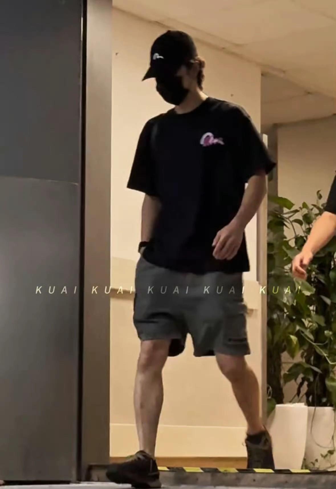 王一博9点就出发了。穿的清清爽爽的,短裤+T恤。 T恤不是绿色竹叶青logo,是