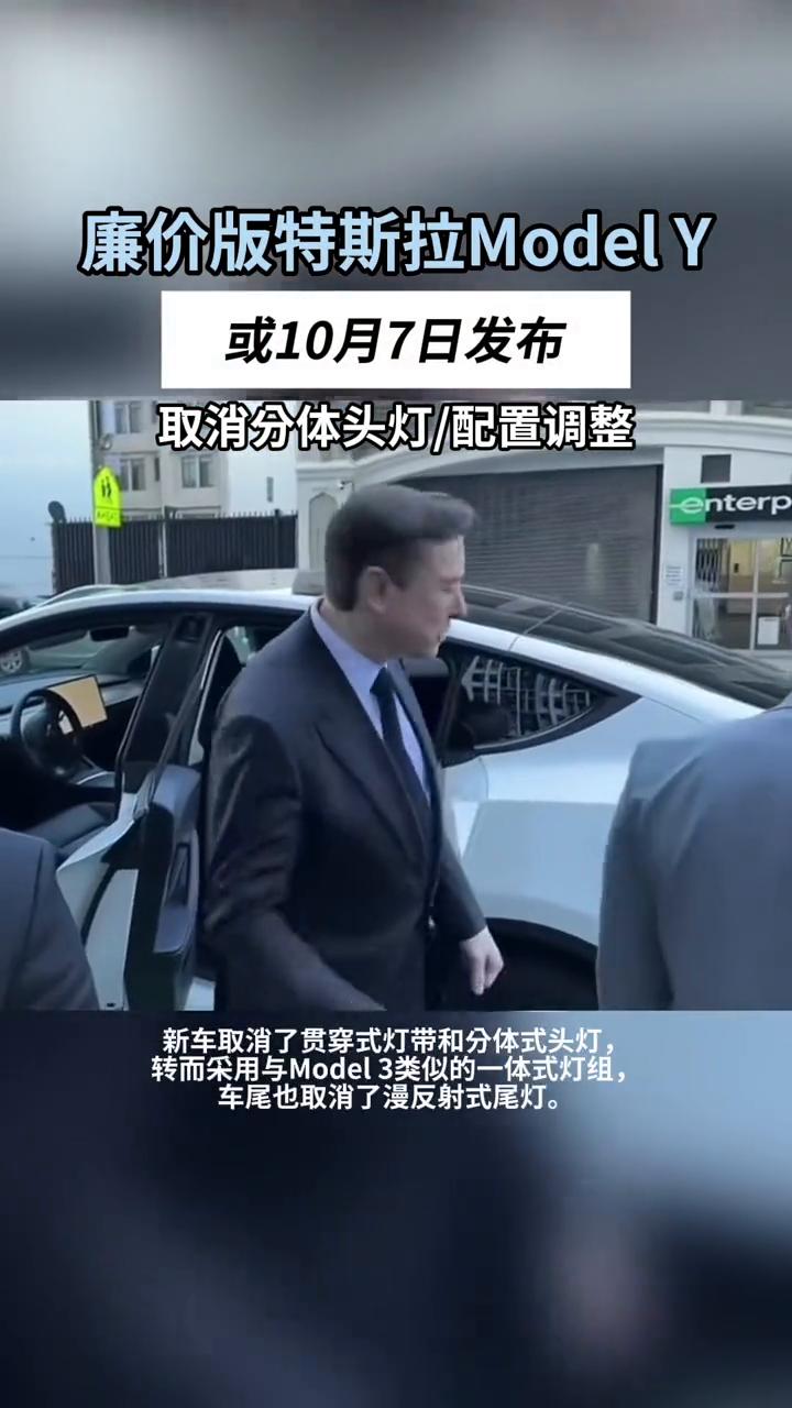 廉价版特斯拉ModelY或10月7日发布,取消分体头灯/配置调整。 "廉价版"