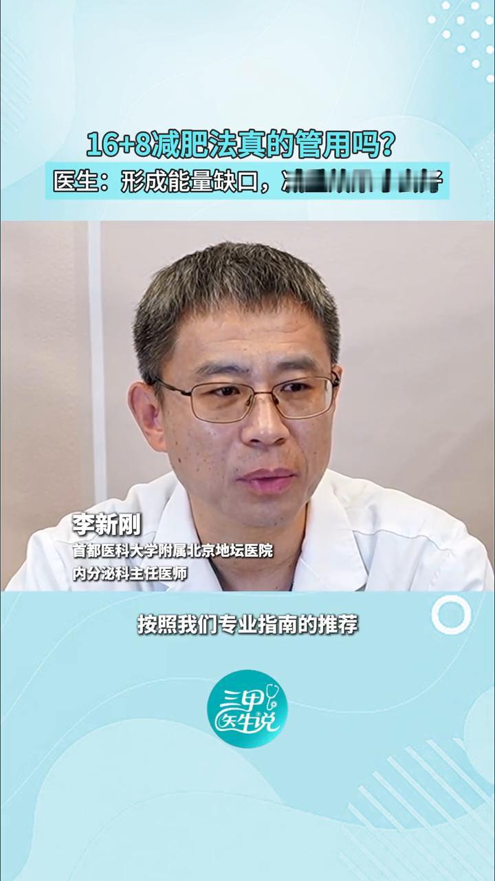 16+8减肥法真的管用吗?医生:形成能量缺口,减重效果才会好。 首都医科大学附属北京地坛医院内分泌科主任医师李新刚。 从目前来看,"16+8"的确是好多网友经常会采用的减少食物摄入的方法。"16+8"饮食法是一种间歇性断食方式,核心是将一天24小时分为"禁食期"和"进食期"。 16小时禁食期:期间不摄入热量(可喝水、黑咖啡、无糖茶)。8个小时进食不能太少,也不能太多,这就是中医上所提到的叫做"中庸"或者叫做"过犹不及"。进餐的时间还是保留在10个小时以上,所以8个小时有可能会引起其他的一些问题,比如能量缺口根本就没有,这种减重效果可能就是不好的。 我倒是建议大家可以尝试尝试这种"5+2"饮食,个人觉得一周7天,有5天是大致正常的,(非连续)两天相对来说摄入的会少一点。按照专业指南的推荐,比如女性患者要求这两天的热量摄入小于600kcal,男性患者尽量地小于800kcal。当然也可以采用一些代餐的方式,这样在一周之内就会产生能量的缺口,有助于体重的恢复。 青蜂侠编辑:申玉萍(实习),窦月华校审:王海。