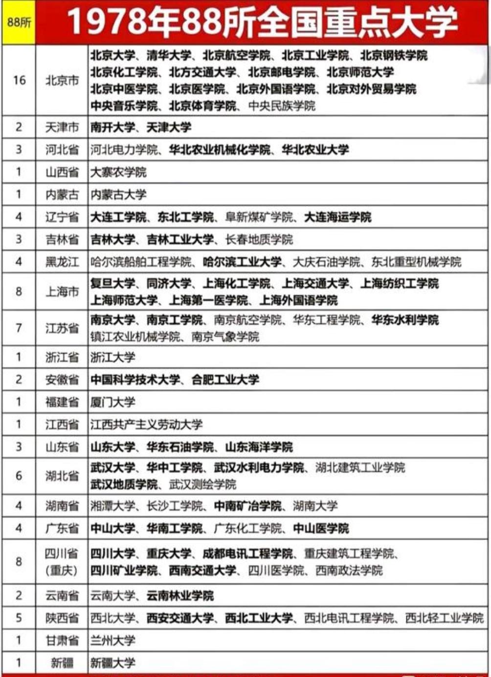 1978年官方确定的88所全国重点大学,现有10所仍有“双非”院校,新一轮“双一流”评选中哪些曾经的全国重点会重现荣光? 全国恢复高考后,首次确定的88所全国重点大学,在国内高校发展史中产生深远的影响。目前,大部分经过重组升级或更名已成为211、985、“双一流”院校,也有很少一部分(10所),错失了几次机遇,从曾经的全国重点大学,落为现在普通“双非”院校。 一、农林类4所 1、曾经的华北农业大学,现为河北农业大学; 2、因农业学大寨而成名的大寨农学院,现为山西农业大学; 3、曾经的江西共产主义劳动大学,现为江西农业大学; 4、曾经的云南林业学院,虽有拆分,部分迁回北京成为中国农业大学,但留下的部分现为西南林业大学。 二、工科类5所 5、曾经的阜新煤矿学院,现为辽宁工程技术大学; 6、曾经的东北重型机械学院,迁入河北后,改为燕山大学; 7、工业学大庆的大庆石油学院,现为东北石油大学; 8、曾经的镇江农业机械学院,现更名为江苏大学; 9、同样有西迁历史的西北轻工业学院,现为陕西科技大学。 三、政法类1所 10、曾经国内政法类头牌,西南政法学院,现为西南政法大学。 上述10所院校,虽错失了几交机会,但经过不懈努力,多数仍保持了鲜明的特色和较强的实力,相信在下一轮“双一流”评选中,燕山大学、江苏大学、西南政法大学和江西农业大学等,很有希望进入建设名单中。