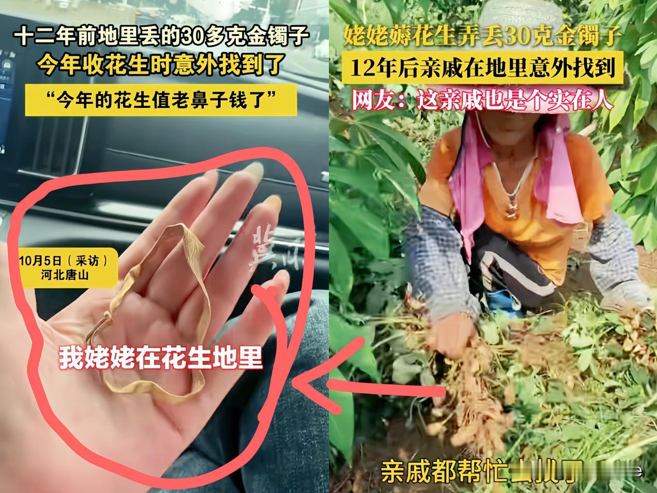 万万没想到!河北唐山,女子的姥姥12年前在花生地里丢30多克金镯子。 今年收花生时意外找到, 女子乐呵地说:“今年这花生可太值钱啦!” 当年丢镯子,全家和亲戚找得那叫一个仔细,连根针都恨不得找出来,可镯子就像人间蒸发了。12年后,亲戚收花生时偶然发现了它,转手就还给了女子家。 都说“黄金有价情无价”,在这件事上展现得淋漓尽致。这亲戚,值得深交!大家怎么认为?