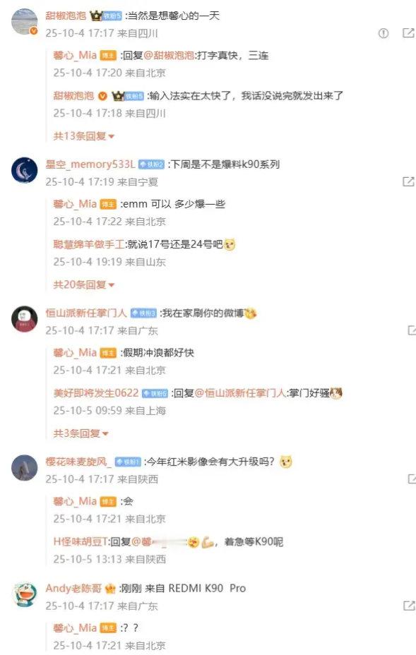 胡馨心还在微博评论区与网友展开了互动:有用户询问“下周是不是爆料 K90 系列?”,她回复称“emm 可以 多少爆一些”;另有用户询问“今年红米影像会有大升级吗?”,她表示“会”。