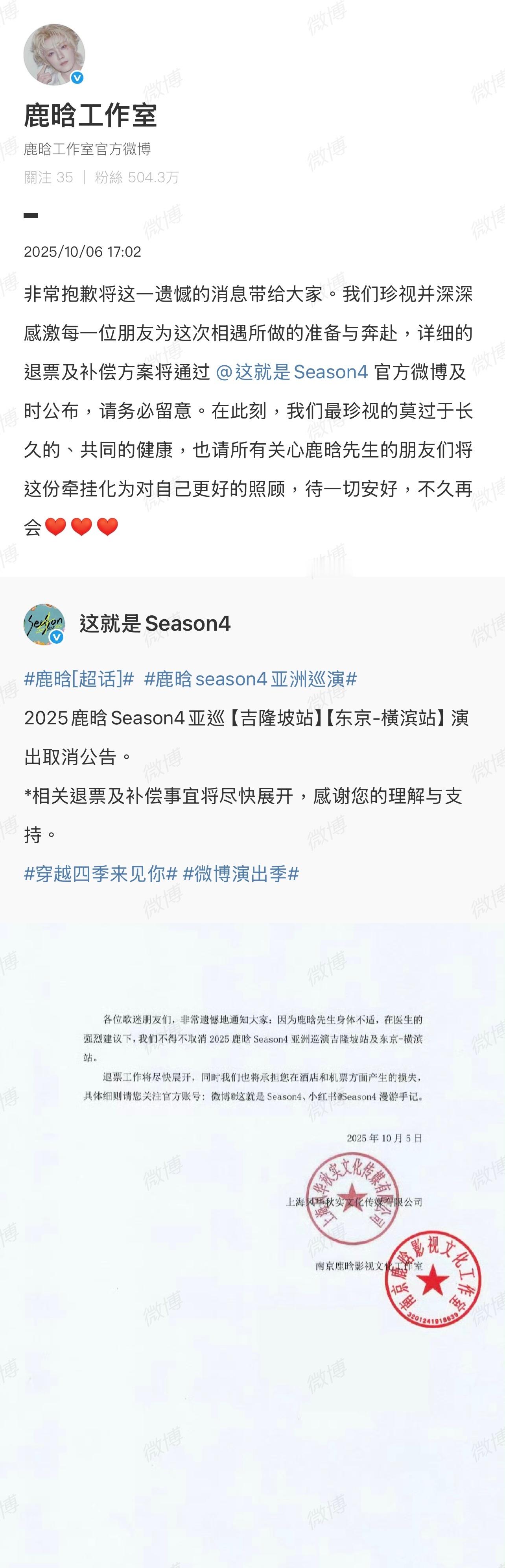 鹿晗因身体不适连续取消两场演唱会![哆啦A夢吃驚][哆啦A夢吃驚][哆啦A夢吃驚