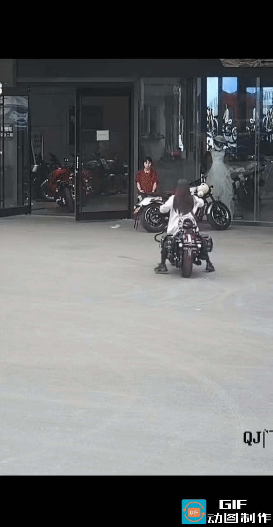 美女一定是忘记松油门了,我刚开始骑摩托车就像她这样,双脚拼命蹭着地,但手却不会松油门,越想刹车越刹不住,最后撞到墙上了。 美女可没有我当时幸运,她是直接朝着人冲过去了。 有人想不通,坐在门前的红衣女子,眼睁睁看着摩托车向自己冲来了,为什么不躲呀,莫非是睡着了。 她不是不躲,她是根本来不及躲,她高估了骑车女子的水平,等发现不妙时,已经迟了。 最终,两人撞到了一块,真是一对好姐妹,有福同享,有难同当。 玻璃门的质量真不错呀,这样撞击竟然都没事。 这就是传说中的马路杀手吧,美女,为了你和他人的安全,劝你最好还是别骑车了。 像你这种样子,骑车上路只会害人害己。 有人说是摆拍,我敢肯定,绝对不是。 任何高明的演员,都拍不出如此真实的情节。