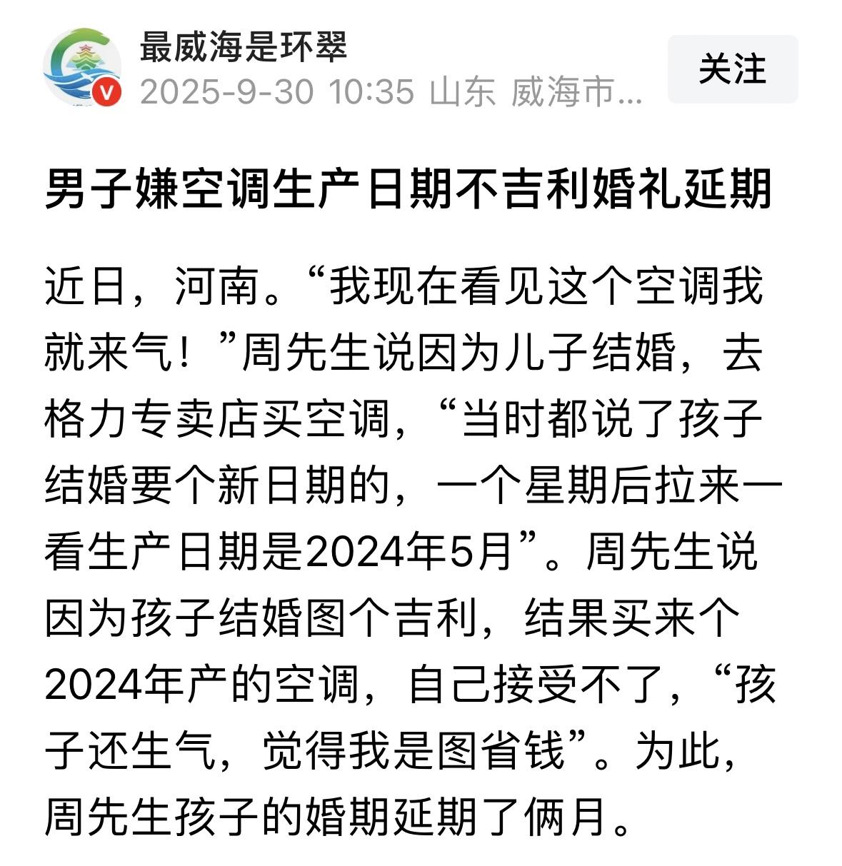 河南,男子给儿子的婚房置办空调,他特意嘱咐店家,家里好事将近,必须要新生产日期的,可收到空调后,男子发现店家不把他的话当话,发来的是2024年5月产的,根本不是今年新产的,男子接受不了,觉得特别不吉利,就找店家大闹一场,还因此把孩子婚期延后2个月,店家也不惯着,做了一个惊呆男子全家的举动。 周先生最近因为一台空调气够呛,这事还得从儿子结婚说起。 他准备给孩子婚房置办个空调,就特意跑到专卖店挑空调,还反复叮嘱销售员,说孩子结婚图个吉利,一定要新日期的机器! 销售员说行,您的需求我记下了,一周后到货了通知您。 一周后空调送到,周先生第一件事就是看空调的生产日期,他一看,是2024年5月产的。 周先生见根本不是今年新产的,他就不乐意了。 他质问销售,说你这哪是新日期?孩子婚期都定好了,现在用旧空调算怎么回事? 原来当地讲究结婚要用新物件图个好彩头,可周先生儿子得之后却觉得父亲是瞎讲究,还问他是不是舍不得花钱? 这事儿一闹,婚期硬生生往后推了2个月。 周先生立刻联系售后,对方却说整个地区的格力空调都是2024年生产的,没有更新的库存。 这答复更让他窝火,双方你一言我一语吵得不可开交。谁知沟通没几天,更离谱的事发生了,安装好的空调外机竟然不翼而飞了! 周先生回忆道,当时大晚上听见吊车响,他还以为是邻居搬家,第二天早上却发现外机消失,他立马报了警。 警察调取监控一看,画面里专卖店老板带着员工,开着吊车在深夜把外机给吊走了。 这下周先生更来气了,说我钱还没退呢,他们倒先动手抢东西? 记者找到专卖店老板核实情况,老板连连喊冤,说这只是个误会! 原来双方沟通时,周先生坚持要退钱或换2025年新机,但当时店里没货。老板担心周先生情绪激动,便想着先悄悄把外机拆回店里保管,等新机到货再送回去,谁知这一举动反而激化了矛盾。 经过记者协调,老板表示新批次的空调已经到货,可以立即为周先生更换2025年生产的新机。 对于半夜拆机一事,老板也承认处理方式欠妥,愿意当面道歉。 周先生虽然心里还有疙瘩,但想着儿子婚事终于能顺利推进,也就接受了调解方案。 有人就说,这结婚图吉利能理解,但生产日期也不是商家能控制的,互相体谅才好。 再者这专卖店老板半夜拆机确实不对,再怎么着也得先和顾客商量不是? 那么,从法律角度,怎么看待这件事? 《消费者权益保护法》第55条规定:经营者提供商品或者服务有欺诈行为的,应当按照消费者的要求增加赔偿其受到的损失,增加赔偿的金额为消费者购买商品的价款或者接受服务的费用的三倍;增加赔偿的金额不足五百元的,为五百元。 周先生明确要求“新日期空调”以配合儿子婚期,格力专卖店在明知当地存在婚庆用新物的习俗且周先生强调特殊需求的情况下,仍交付2024年5月生产的空调,且未提前告知生产日期,从严谨的角度来看,可能存在故意隐瞒关键信息的欺诈嫌疑。 如果周先生因此诉至法院,那么法院可能认定专卖店构成欺诈,周先生可主张三倍购机款的惩罚性赔偿。 例如,如果空调价值5000元,则可索赔1.5万元,远超实际损失。 《民法典》第582条规定:履行不符合约定的,应当按照当事人的约定承担违约责任。对违约责任没有约定或者约定不明确,依据本法第五百一十条条的规定仍不能确定的,受损害方根据标的的性质以及损失的大小,可以合理选择请求对方承担修理、重作、更换、退货、减少价款或者报酬等违约责任。 周先生与专卖店成立买卖合同关系,合同核心条款为“新日期空调”。专卖店交付2024年5月生产的空调构成履行不符合约定,应承担违约责任。 根据法条,周先生有权选择继续履行如更换2025年新机、解除合同,如退货退款,或要求赔偿损失,如婚期延期产生的场地租赁、宴席取消等间接损失。 专卖店擅自拆机的行为进一步加剧违约程度,法院可综合判定其承担更换新机、赔偿婚期损失等连带责任。 如今周先生家的新空调已经换好,2025年生产的机器亮锃锃地挂在墙上。儿子婚礼重新定在下个月,这次总算能顺顺当当办了。 对此,你怎么看? 关注@运良说法 学法律知识不迷路