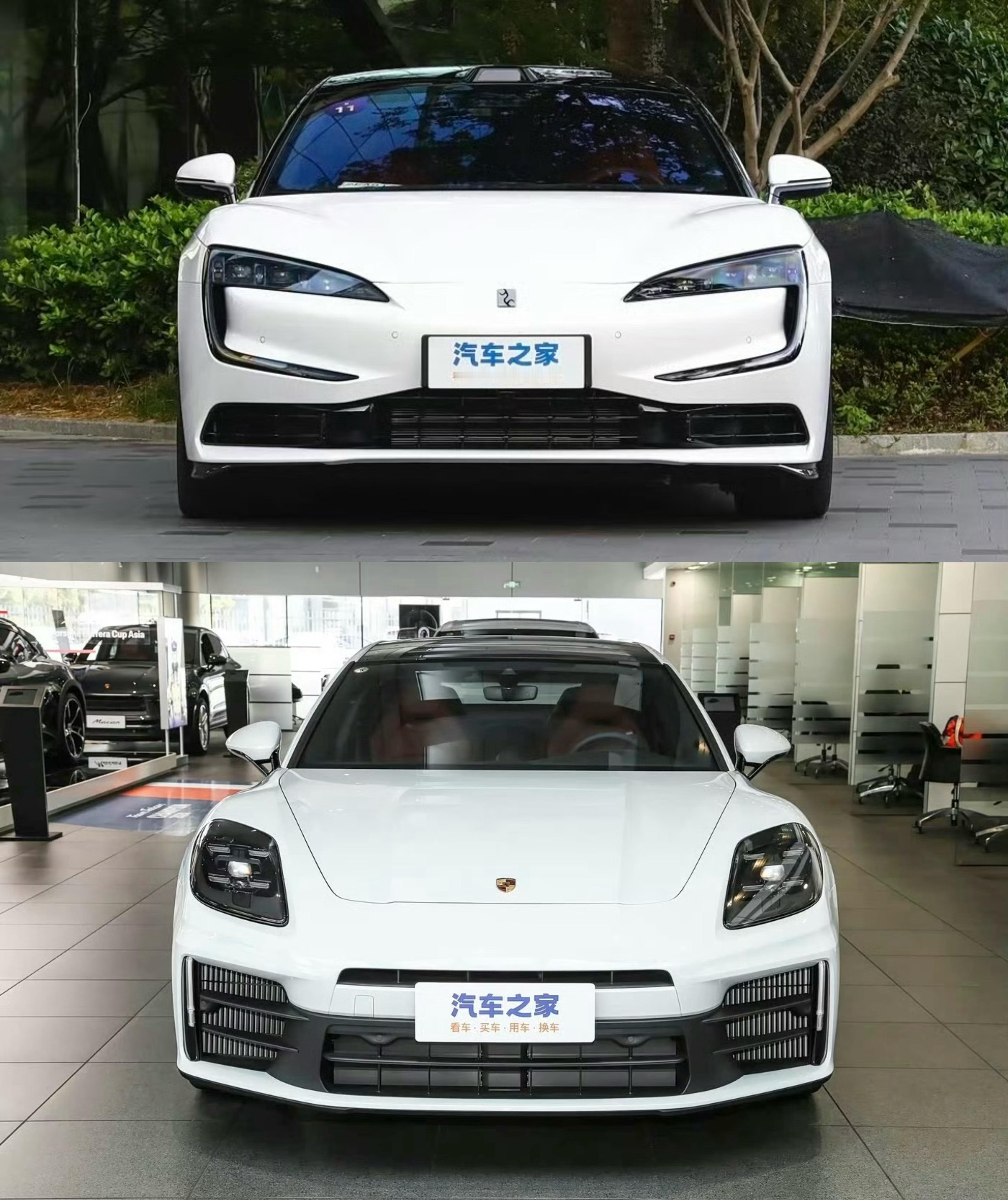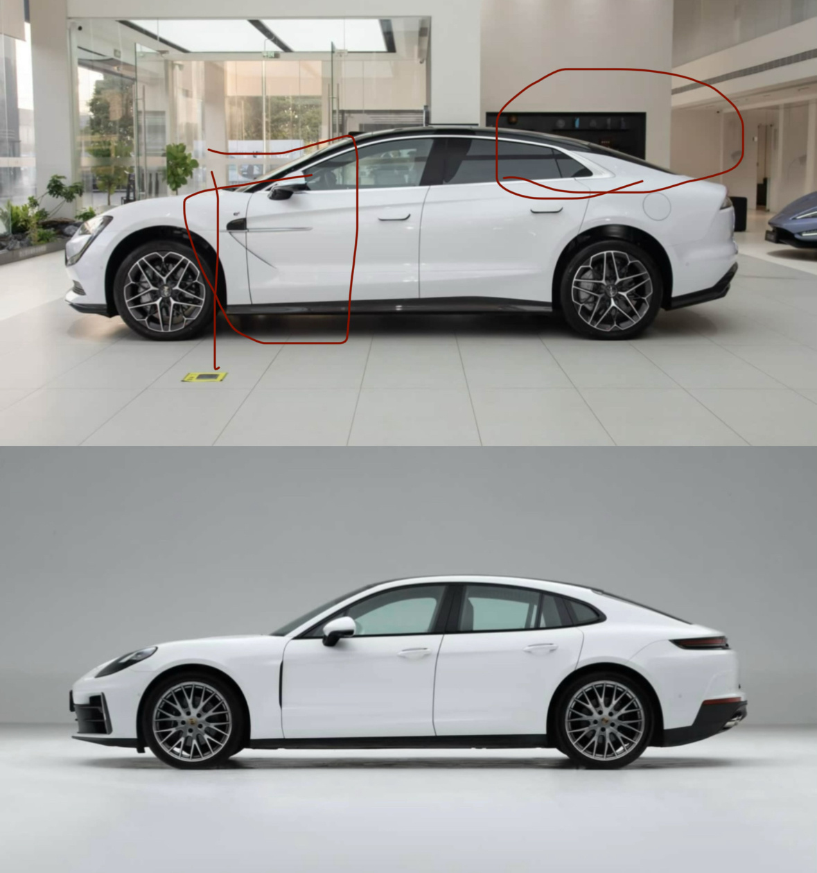 但别管U7 PHEV还是EV,侧面可以说是过度设计的集大成者,看前门板翼子板处的线条和结构,看后车顶处的颜色变化,把花样全用上了,怎么复杂怎么来。再看Panamera,那叫一个简洁优雅舒展。对比起来,U7的侧面简直不能看。