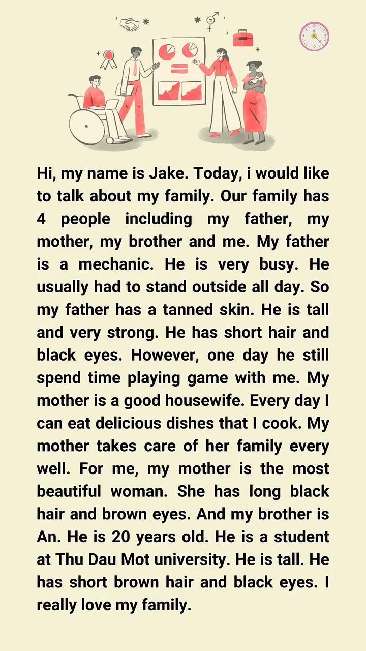 Hi,my name is Jake.Today,i would like to talk about my family.Our family has 4 people including my father,my mother,my brother and me. My father is a mechanic.He is very busy.He usually had to stand outside all day.So my father has a tanned skin.He is tall and very strong.He has short hair and black eyes.However,one day he still spend time playing game with me. My mother is a good housewife.Every day I can eat delicious dishes that I cook.My mother takes care of her family every well.For me,my mother is the most beautiful woman.She has long black hair and brown eyes.And my brother is An.He is 20 years old.He is a student at Thu Dau Mot university.He is tall.He has short brown hair and black eyes.I really love my family.