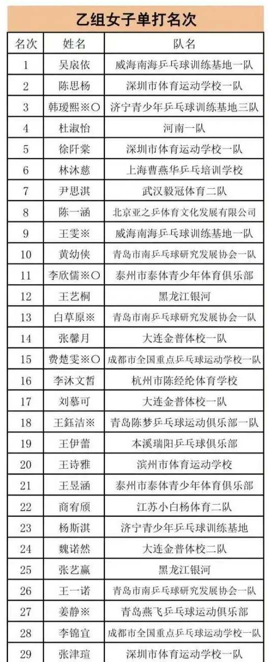 笑笑郭依嘉没参加单打?2025年全国青少年乒乓球锦标赛女单排名,威海南海乒乓球训练基地的吴扆依战胜大热门深圳队的陈思扬夺冠,济宁的韩瑷熙第三,河南杜淑怡第四,深圳徐阡堂第五,上海林沐慈第六,名字都是越来越少见,但是我没看到前30名有王楠的女儿笑笑,郭依嘉什么情况?