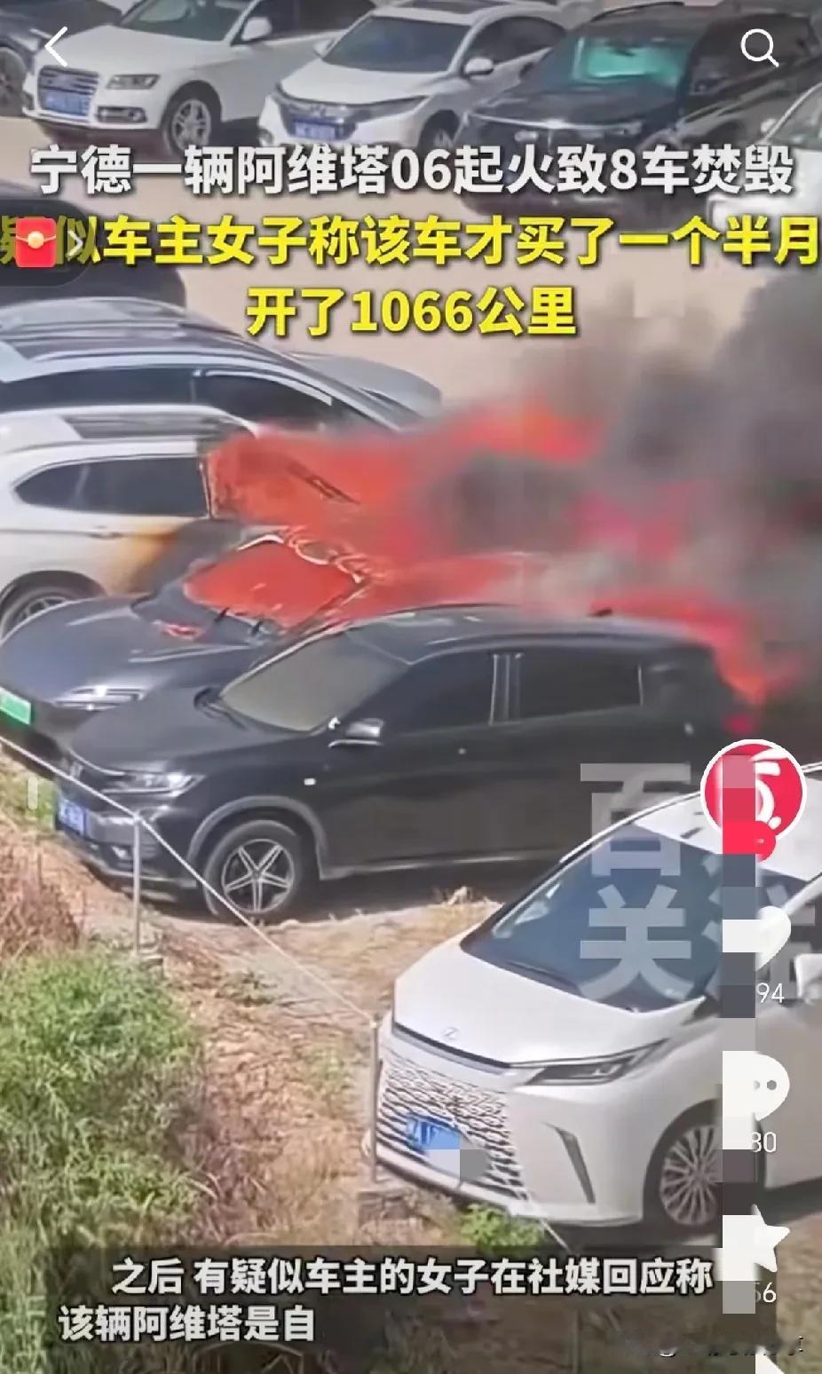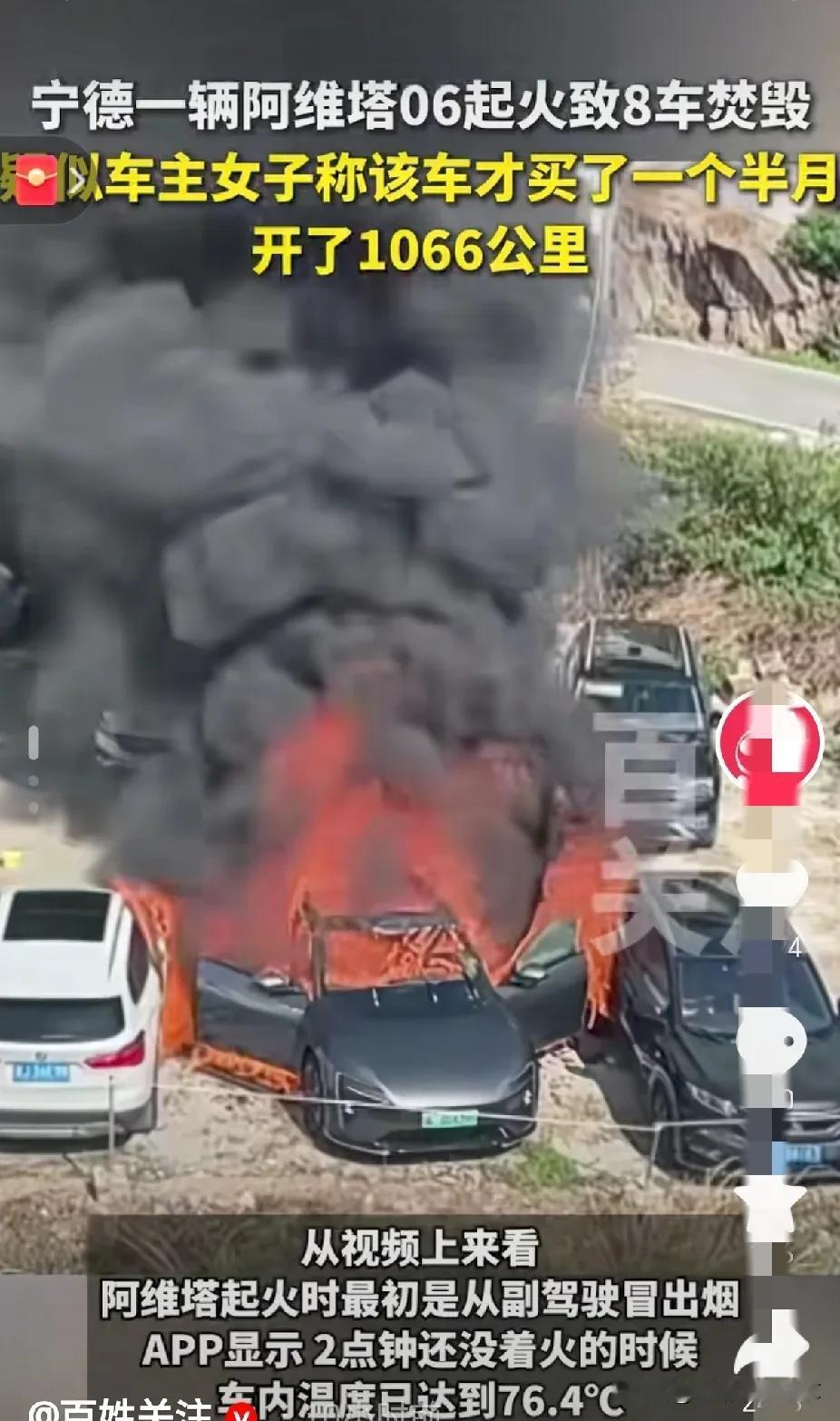一觉睡醒, 阿维塔的天塌了! 自家阿维塔06 汽车在福建宁德一景区停车场自燃,还烧毁了好几辆同场地的车! 2025年10月5日,福建省宁德市霞浦县三沙镇东壁村发生一起阿维塔轿车自燃事件。现场多辆小车被烧毁,无人员伤亡。 据疑似车主在网上发布的信息,她的阿维塔06是8月28日购买的,使用了一个半月,开了1066公里。 尽管目前官方还没有发布具体自燃原因,但现在各位“阿维塔06”车主已经“瑟瑟发抖”了,就是怕自己成为第二个! 万幸的是,此次自燃事件没有造成人员伤亡! 不管什么原因引起的自燃,我们都应该注意安全! 高温天气,车子尽量停放在没有太阳照射的阴凉处,避免车内温度过高引起的一系列问题! 大家觉得呢?