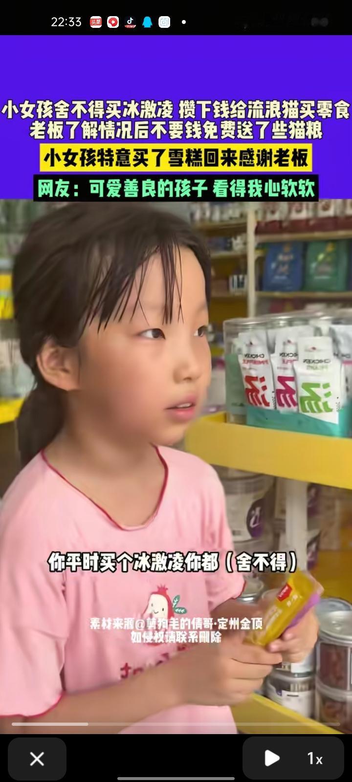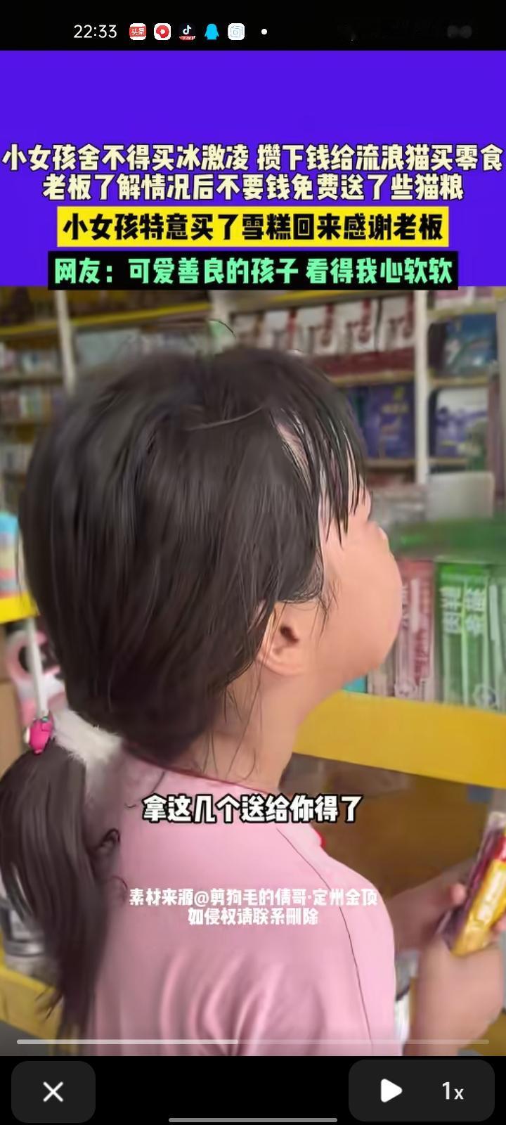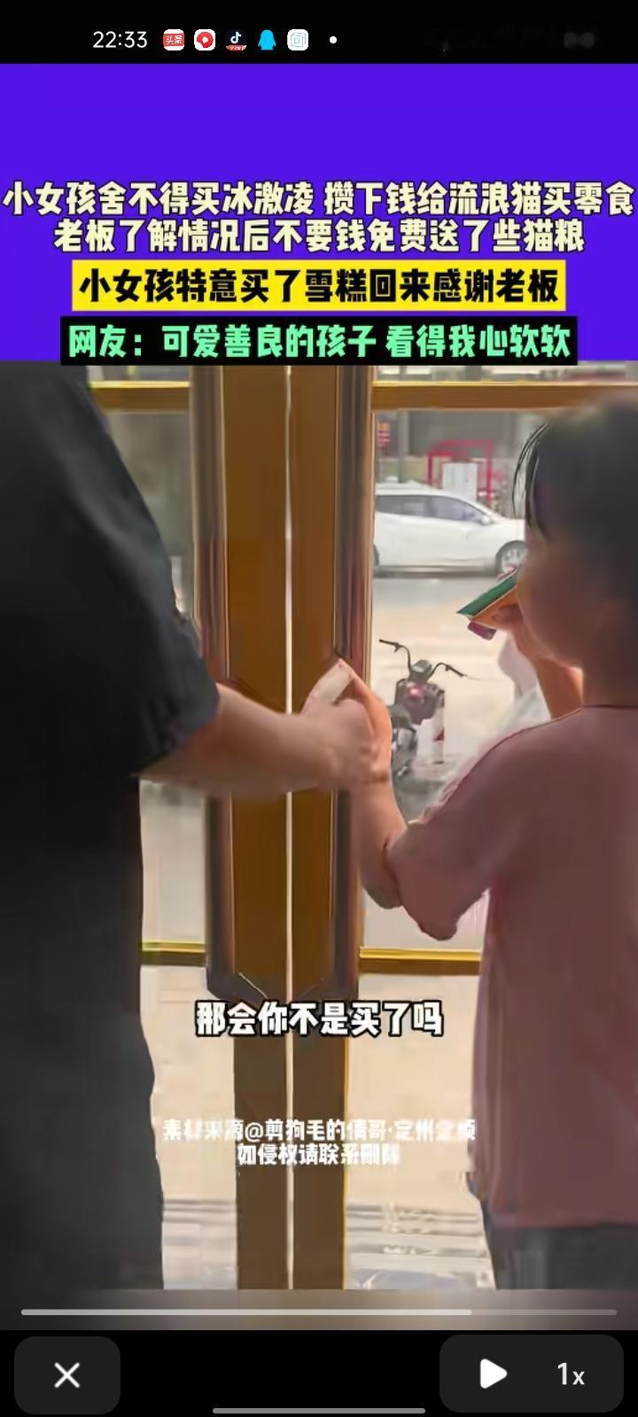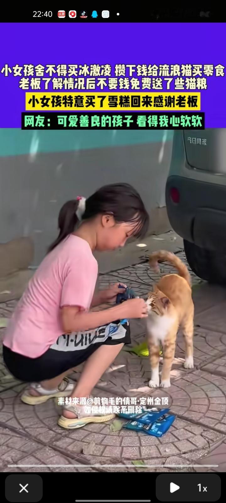 10月5日,保定定州市。小女孩在路边遇到流浪猫,她的妈妈不让把流浪猫带回家。来到宠物店,小女孩舍不得买冰激凌,攒下钱给流浪猫买零食。老板了解情况后,决定不要钱免费送她猫粮。随后,小女孩特意买雪糕回来感谢老板。