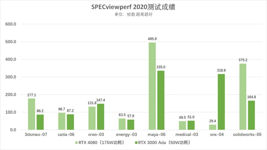 可以看到,在大部分项目中,即使RTX 3000 Ada仅有50W的功耗,也能和175W功耗的RTX 4080有来有回,甚至在西门子NX中有着10倍的性能提升。
