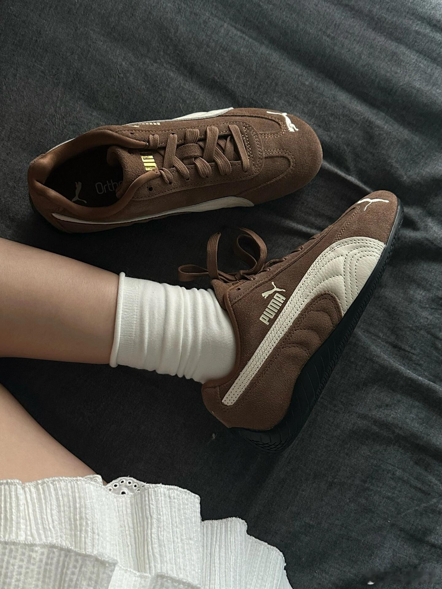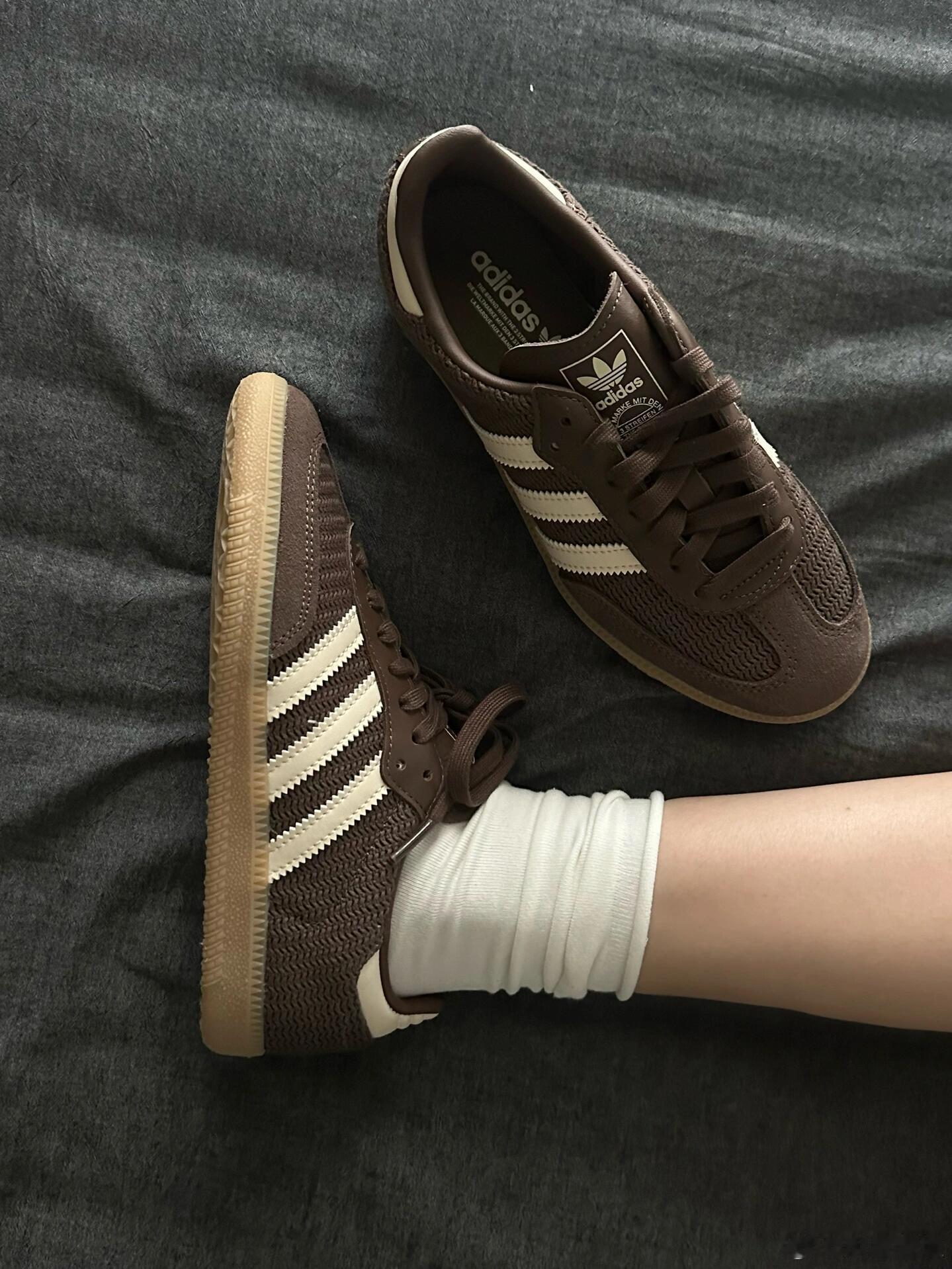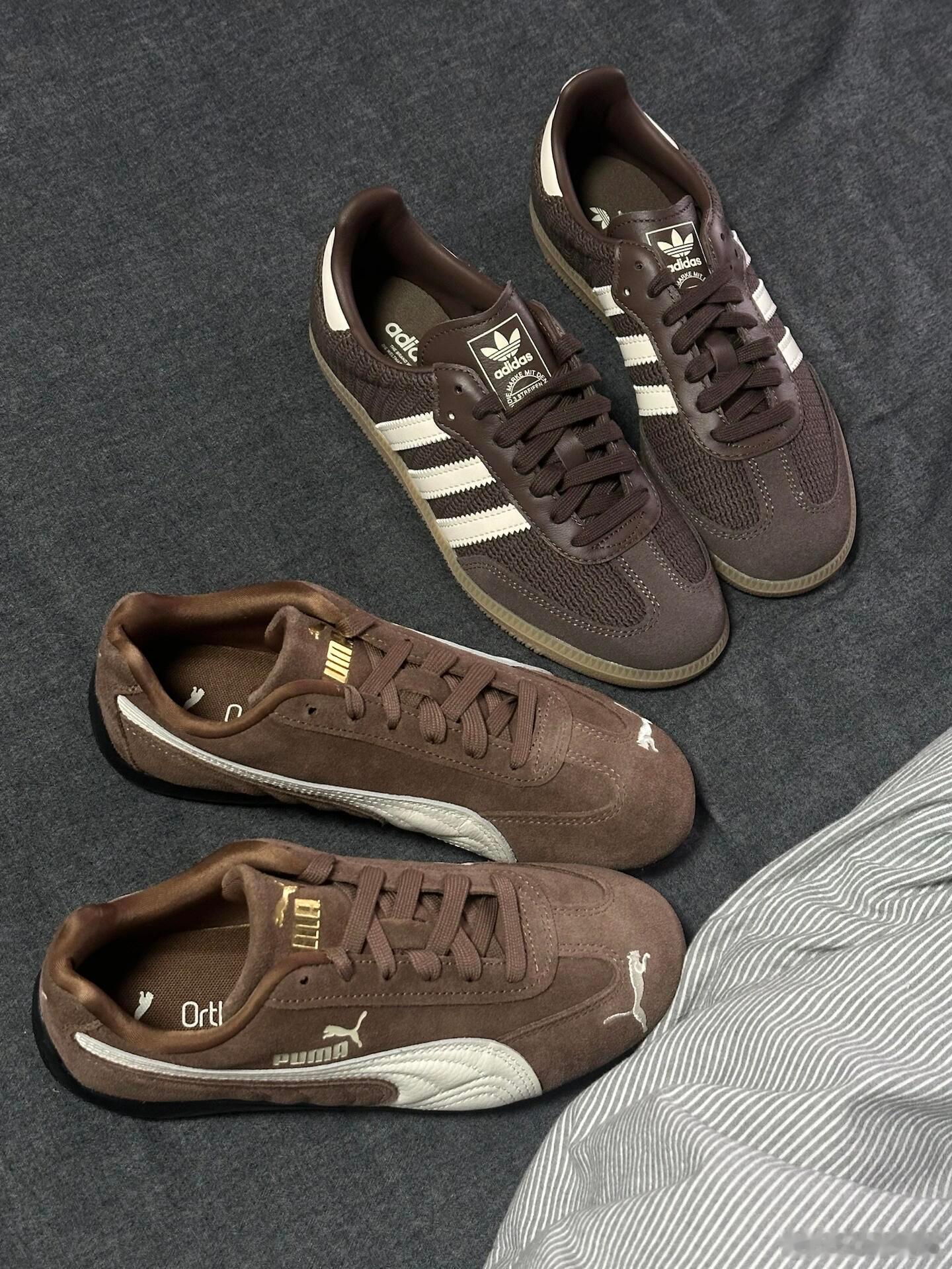 经典的阿迪达斯Samba,采用深棕色皮革与网眼材质拼接鞋面,标志性的三条白色条纹与鞋舌上的金色三叶草logo格外醒目。右侧同色系的彪马鞋则选用麂皮质感面料,通过鞋舌的白色美洲狮标识和鞋侧细长条纹展现品牌特征。两款鞋均配以米白色橡胶底,与穿着者的浅色堆堆袜相得益彰,整体搭配简约舒适,深棕主色调与米白、白色细节构成和谐画面,完美演绎了日常休闲穿搭的随性与格调。时尚鞋履SOTD鞋控的日常