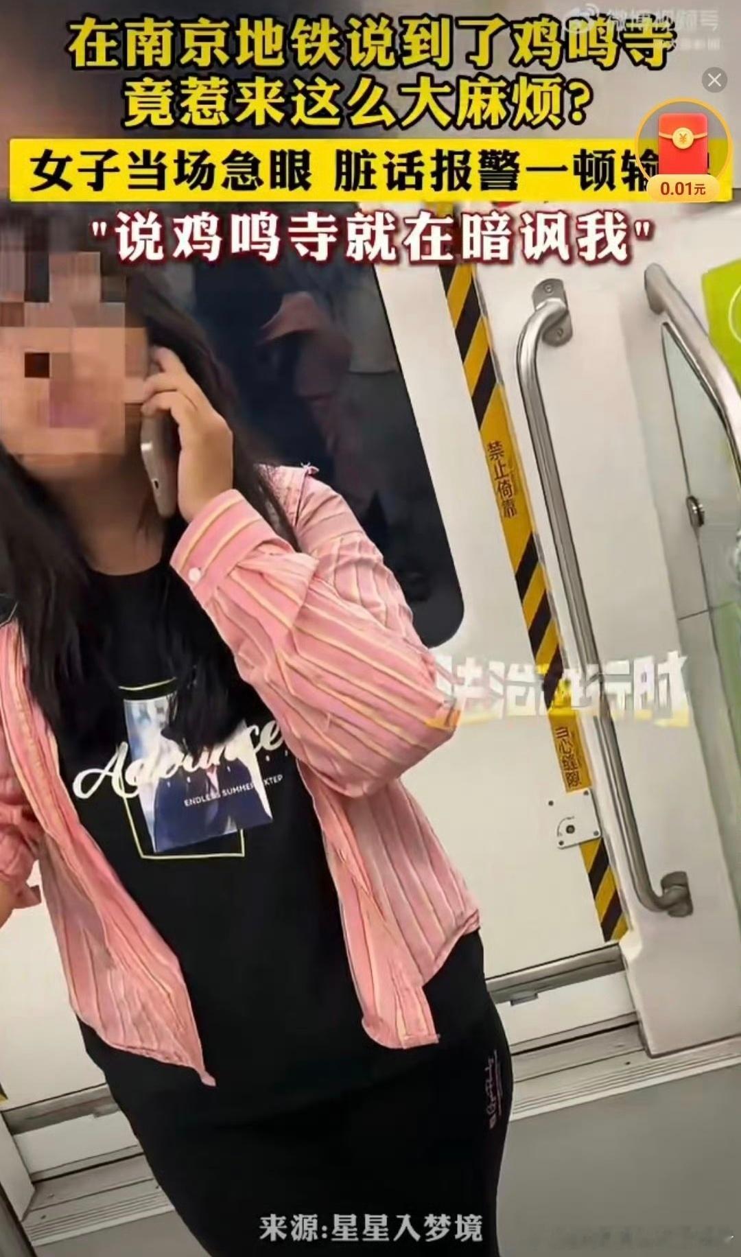 南京地铁鸡鸣寺事件当事人发声感觉这人是不是不太正常?听到鸡鸣寺情绪这么激动,这正常人根本联想不到其它方面啊。为何她觉得是在说自己?那以后直接叫坤鸣寺或者只因鸣寺吧,这样就没人去找事了吧。