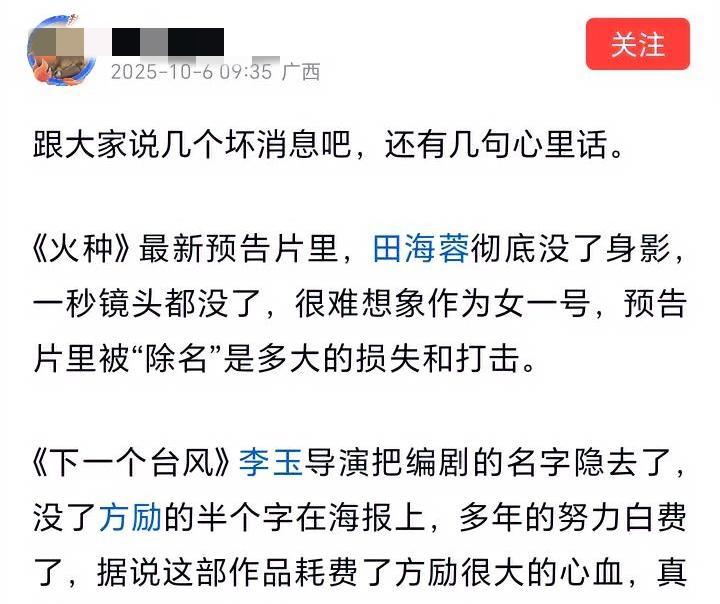 网上说《火种》AI换人,田海蓉都不在了! 但是我查看了下,并没有啊!田海蓉还在,而且上映时间也没变,是10月16日。 除了这个AI换人,还有说《火种》已经把田海蓉除名了,预告片里彻底没了身影,一秒镜头都没了…… 还有说田海蓉的公司“蓉海映像”,现在被金融局盯上了,连融资资格都悬了…… 我特地查了下,并没有这回事,猫眼的资料里,田海蓉还是女一号,排在富大龙、姜武后面,第三位置。而且播出时间并没有改,还是如期上映! 我搞不懂,为什么那么多人造谣?尽管有些人说与什么有关,但是都是没影的事啊!没有任何官方消息和证据证明,他们之间有任何关联。 但即使这样,依然被很多人抵制,谩骂。 我不是偏袒谁,我只是觉得很可怕,怎么可以这样随意给人扣帽子,这是要杀人啊!如果这个人是你,你自己作何感想?