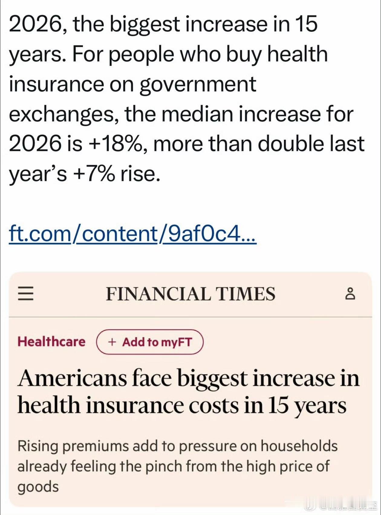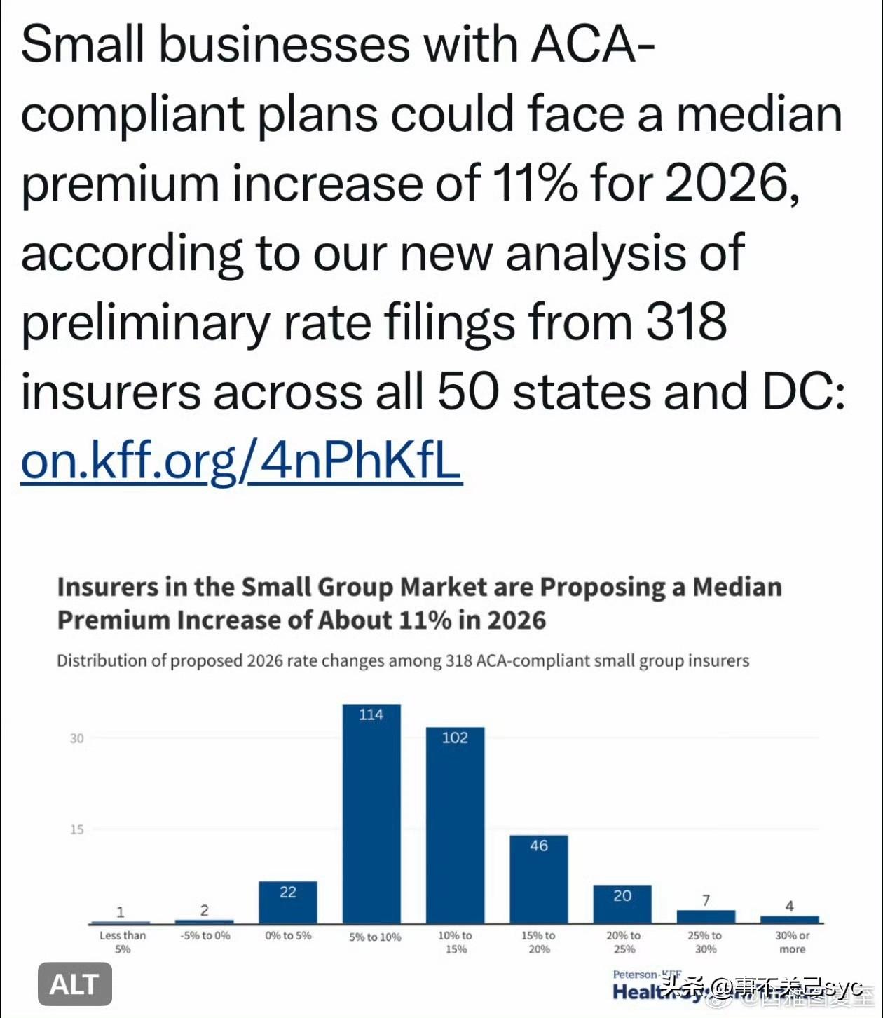 美国政府关门第六天,根据目前的信息,两党在医保等关键议题上僵持不下。若僵局持续,民众明年的医保费用确实可能面临显著上涨。 目前民主党还在争取医保补贴,如果共和党始终不同意,小企业明年医保费用预计增加11%,个人明年保费预计增加18%,十五年来最大涨幅 。 目前看,民主党的诉求是希望在新临时拨款法案中,延长将于今年年底到期的《平价医疗法案》(即“奥巴马医保”)加强型补贴,并撤销此前对联邦医疗补助的削减。 共和党的立场倾向于先通过一个“干净”的临时拨款法案,按现有水平维持政府运转,待政府重新开门后再讨论具体的医疗补贴政策。 如果两党无法就补贴问题达成一致,预计到2026年,美国个人和企业的医保费用将面临显著上涨。最高可涨54%。保险公司会将保费上涨的部分加到个人头上。美国中下层民众可能会面临看不起病的威胁。 这就典型的党争恶果。