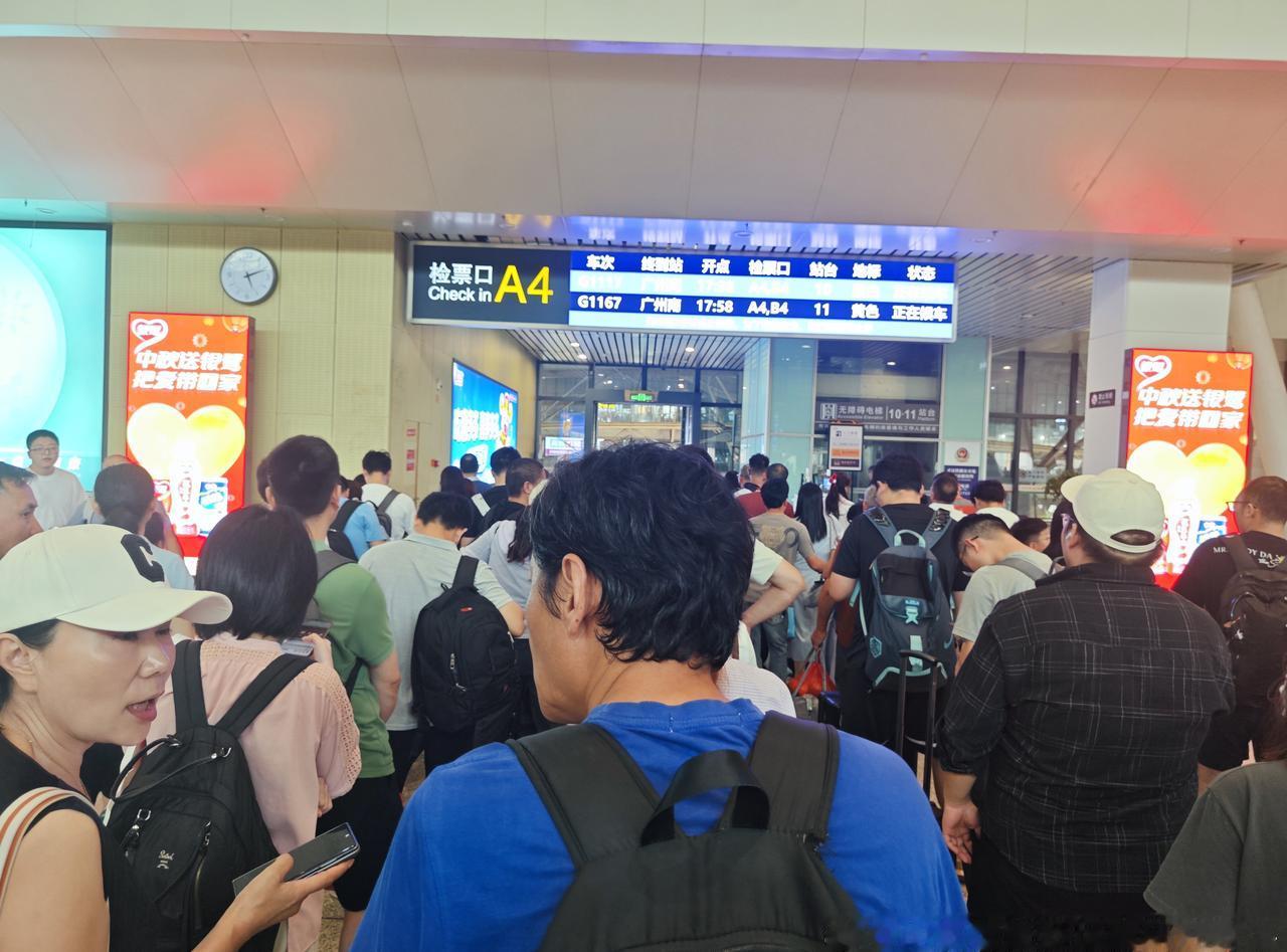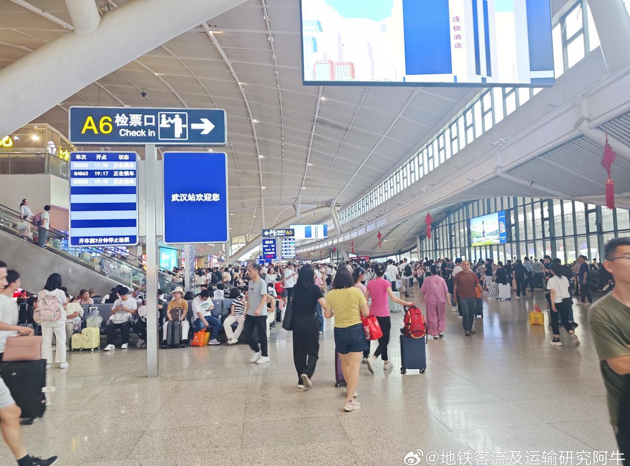 网友:2025年10月6日,国庆中秋假期第6天,中秋节,武汉晴, 图1,14:19武汉地铁5号线(红霞-武汉站(东广场),6A,间隔约5.5分钟)复兴路-彭刘杨区间客流; 图2,15:58武汉地铁4号线(柏林-武汉火车站,6B,间隔4分钟)首义路-武昌火车站区间客流; 图3,16:30本车终到武汉站前客流; 图4,16:41国铁武汉站候车室客流; 图5,17:15国铁武汉站G1117次(武汉-广州南,广铁广州南所CR400BF-Z型,定员578人)准备检票客流。