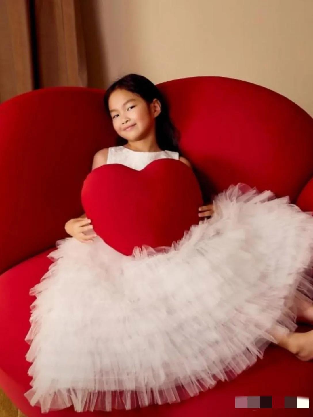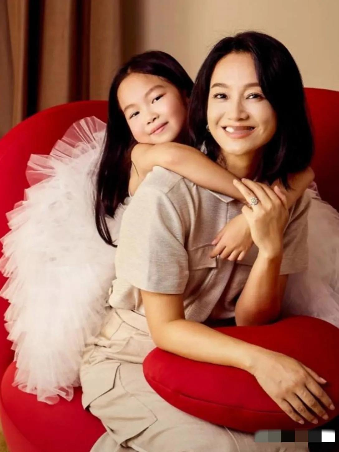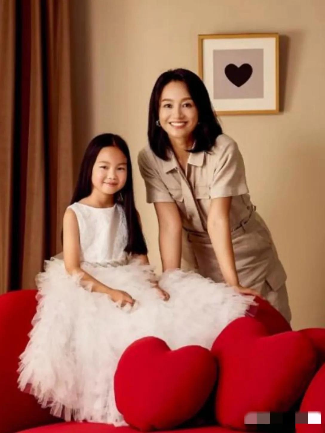朱丹晒与女儿的合照:8岁的女儿长发飘飘,眉若新月,丰颊小眼,脸型上窄下宽,鼻孔外