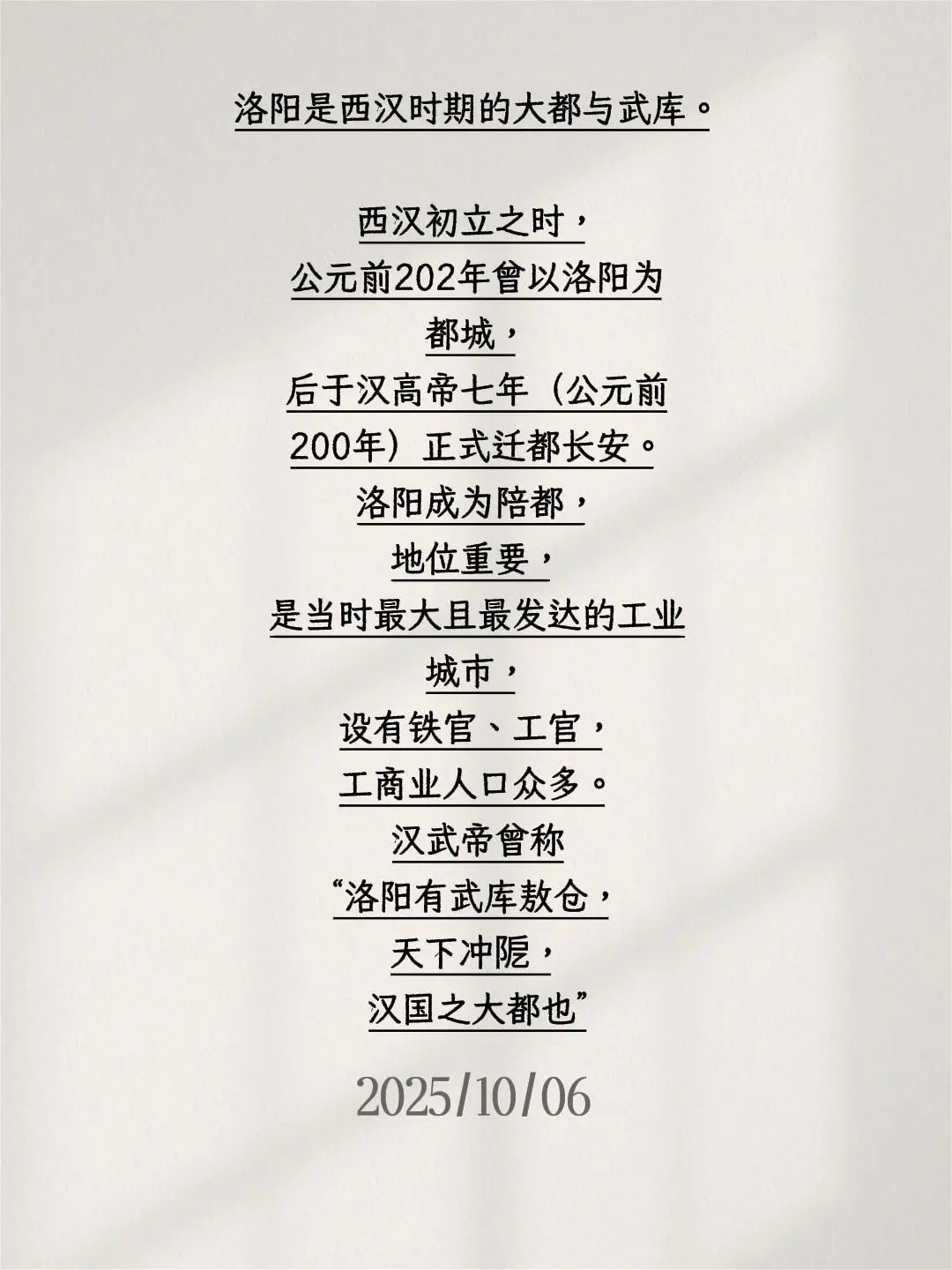 西汉初立之时,公元前202年曾以洛阳为都城,后于汉高帝七年(公元前200年)正式迁都长安。洛阳成为陪都,地位重要,是当时最大且最发达的工业城市,设有铁官、工官,工商业人口众多。汉武帝曾称“洛阳有武库敖仓,天下冲阸,汉国之大都也”