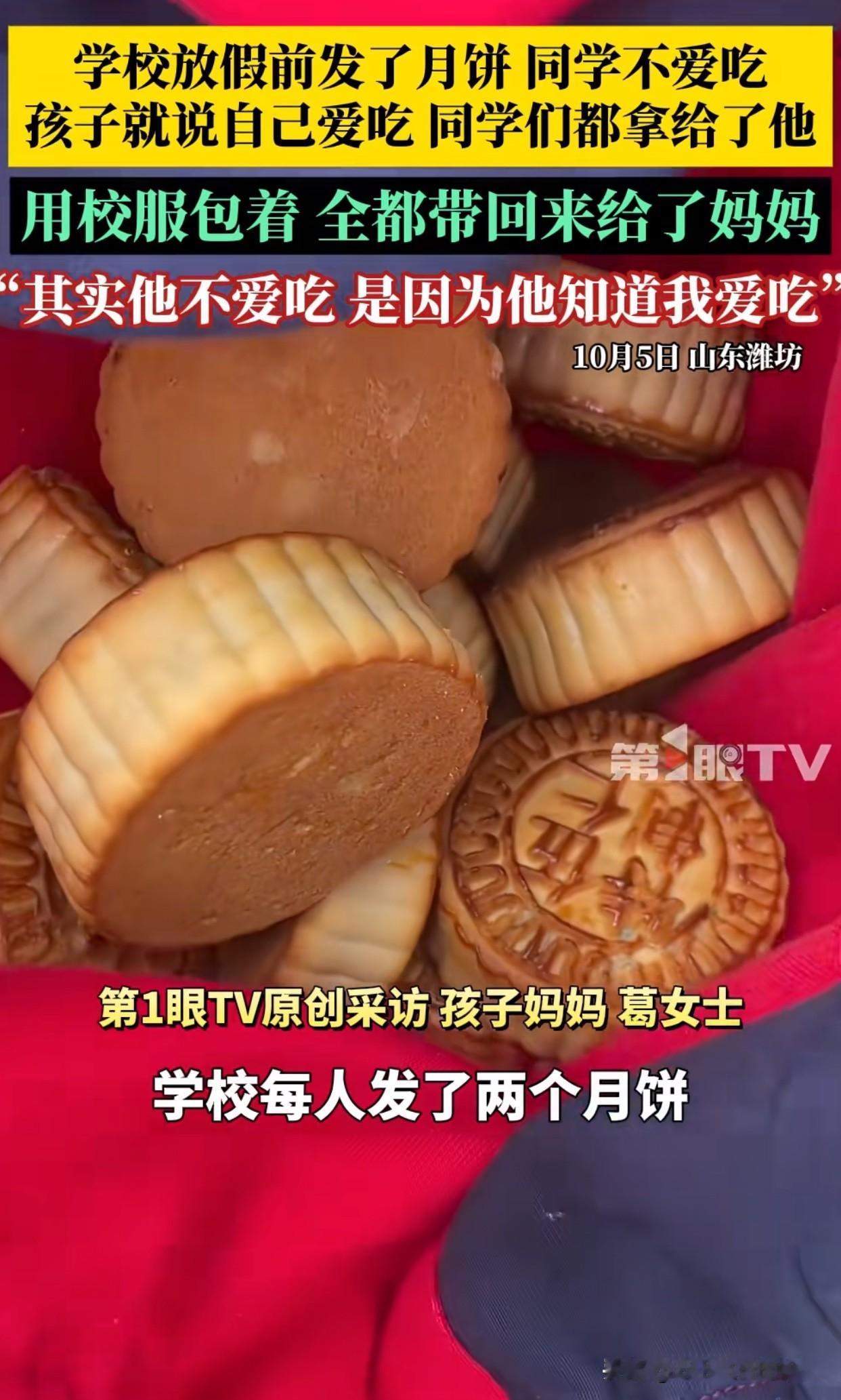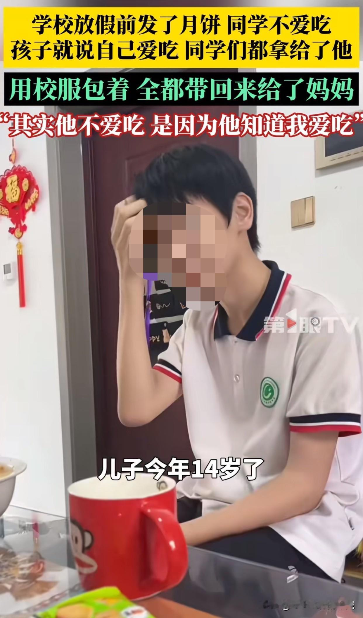 “男孩也可以是贴心小棉袄!”重庆一男孩用校服兜月饼回家的事最近火了!妈妈问他:"你不是不爱吃吗?"孩子一句"你喜欢呀",让妈妈感动得不行。网友们都说:原来儿子也可以这么贴心! 事情是这样的,学校发了五仁月饼,同学们都不太想要,就这个男孩主动收下。他用校服兜着月饼,哪怕衣服被油浸透了也开心地跑回家。这份心意,真的让妈妈瞬间泪目。 说实话,我觉得这已经不只是一块月饼的事了。孩子能记住妈妈随口说过的喜好,用自己最实在的方式表达爱,特别打动人。 要我说,现在的孩子不是不懂得感恩,只是有时候缺少表达的机会。我觉得教育孩子最重要的,不是他成绩多好,而是他心里有没有装着家人。中秋节最让人温暖的,从来都不是月饼有多好吃,而是有人时刻把你放在心上的那份心意。