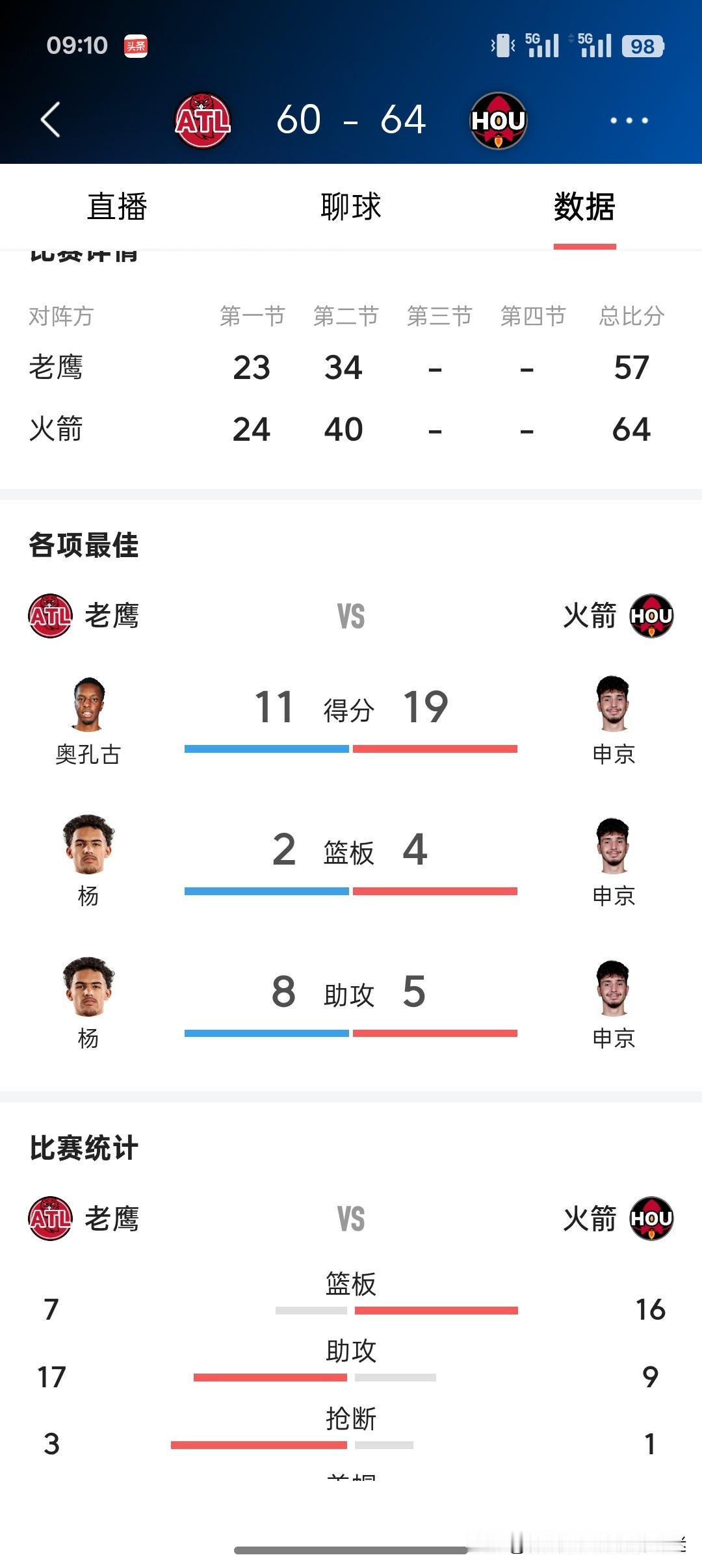 火箭今日季前赛上半场结束,火箭64-60,领先老鹰4分。上半场火箭探花谢波德在范