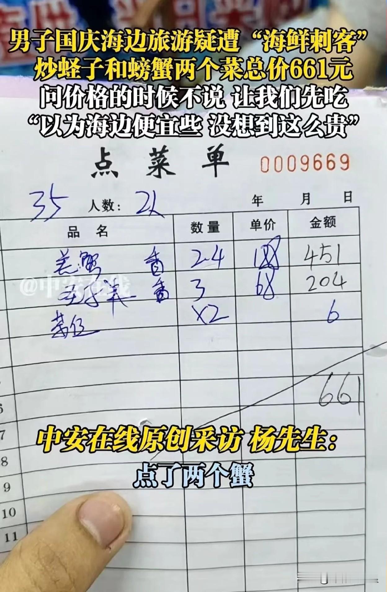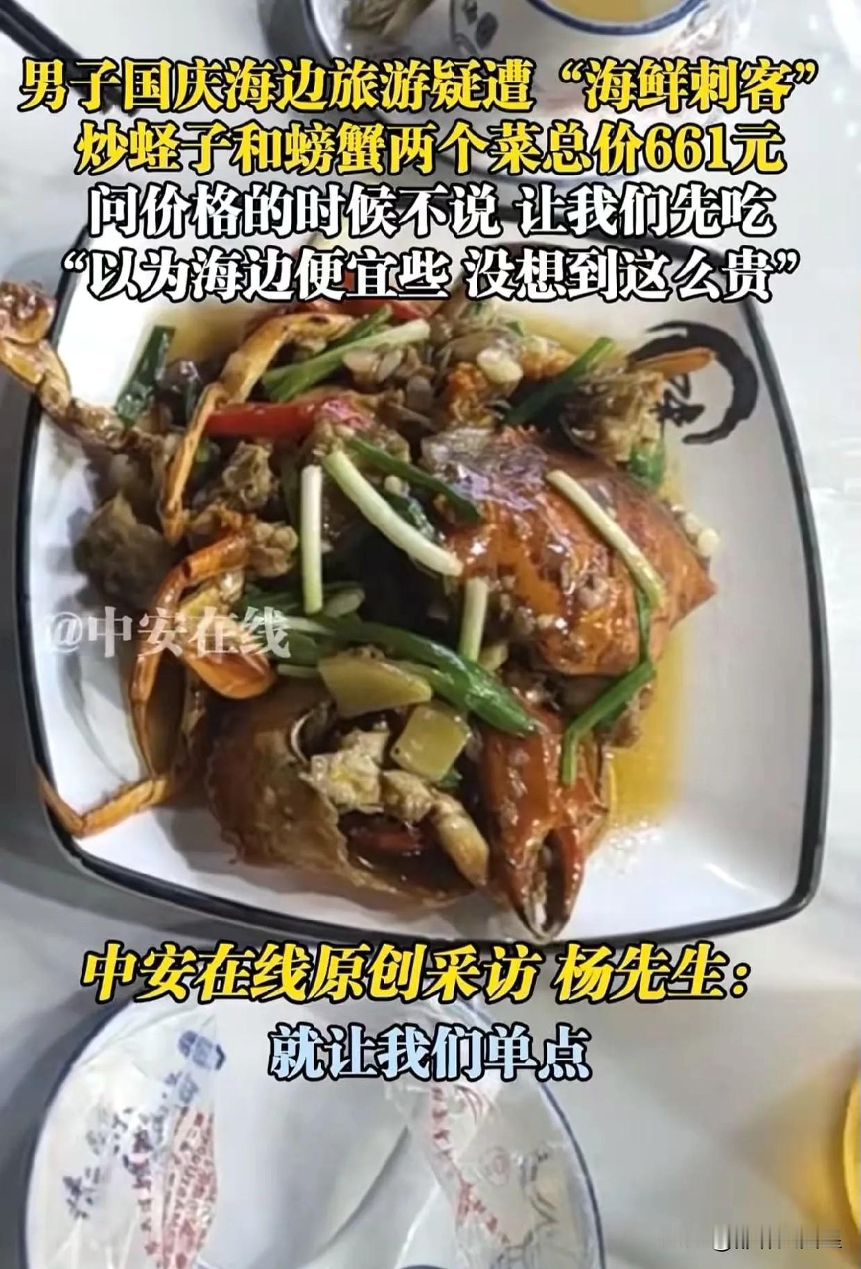 大家有没有发现,消费前不把价钱问清楚就掏钱的人,简直就是傻冒! 有个男子国庆去广东海边旅游,没问价格就点了一盘炒蛏子和两只螃蟹,结果老板收了他600元。他觉得挺冤,可这明明就是自己犯傻,之后他还把这事发到网上,这下全网都知道他傻了。 一男子带家人在广东旅游时,从网上团购了一家饭店的优惠套餐。可到了饭店,老板说套餐过期了,只能单点。男子询问价格,老板含糊其辞,让他先点菜。于是男子点了两只螃蟹,又点了一份蛏子。没想到吃完结账,竟花了661元。 男子一看菜单,上面写着:螃蟹2.4斤,每斤188元,共451元;蛏子3斤,每斤68元,共204元。 男子心想,小螃蟹市场价也就70元左右,蛏子不过20元一斤,这明显比市场价高出好几倍,这老板也太黑心了! 于是男子把这事发到网上,引发网友热议。有网友说,去广东旅游一定要先问价再消费。之前他们在海陵岛也遇到过这样的海鲜餐厅,点了四五个菜花了3000多,他们不宰客都不好意思说自己是广东人。 也有网友说,是他自己消费前没问清楚,怪不得别人。 这件事之后,估计这男子以后吃饭,肯定不会再犯同样的错了。 同时,这件事也提醒大家,出门消费,不管是买东西还是吃饭,一定要先问清价钱再掏钱。 对此,大家怎么看?