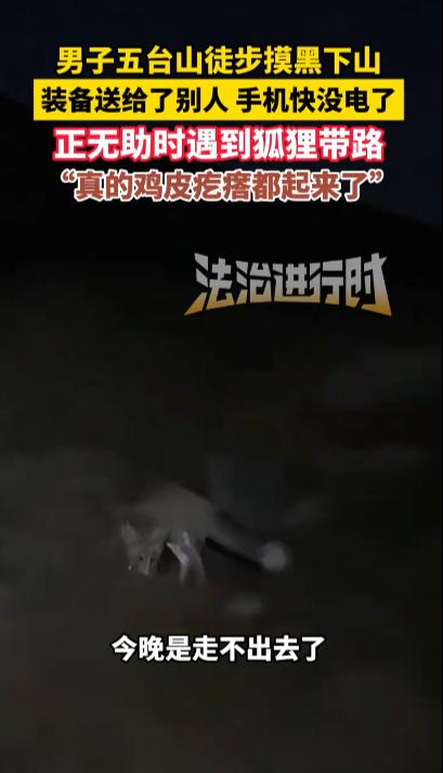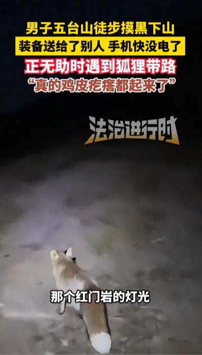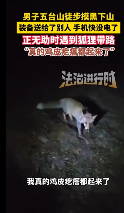 “万物皆有灵!”10月3日,山西忻州,一男子徒步五台山深夜被困,正当他担心出不去时遇见了一只狐狸,男子跟着狐狸走了10分钟,竟然真的走到了出口附近,他表示当时鸡皮疙瘩都起来了,网友:估计老祖宗在下面动用了所有的关系! 动物帮助人类的事件频频发生,古往今来,多少故事记载着动物有灵性,艺术源自生活,这些故事的灵感大多来自现实,万物皆有灵,有时你不得不相信。 一男子十一期间准备徒步五台山,他打算以鸿门岩为起点,在三天内走完38公里左右的路程返回原点,计划已经成型,假期的第二天男子便上了五台山。 在路途中男子遇到了需要帮助的驴友,将自己的登山装备送给了他,临近傍晚,男子忽然发现随身携带的充电宝坏了,手机还有二十几个电,此时天已经渐渐黑了下来,他只能选择摸黑下山。 晚上视线极差,徒步路线一般都是些山路,男子觉得自己应该出不去了,正在这时,一只小狐狸忽然出现在男子面前,它直勾勾盯着男子,然后转身向一个方向走去,期间狐狸两步一回头,生怕男子没跟上。 男子觉得有些新奇,便跟着狐狸走了10分钟左右,没想到这只狐狸竟然将他带到了徒步路线的终点附近,那一刻,男子身上的鸡皮疙瘩一下起来了。 在狐狸的帮助下,男子已经顺利下山,不少网友认为这狐狸是来“报恩”的,也有人觉得男子将自己的装备送人,狐狸感觉他是个善良的人,便给他引路,不管怎么说,这又一次验证了万物皆有灵! 信息来源:《男子五台山徒步摸黑下山,装备送给了别人 手机快没电了,正无助时遇到狐狸带路, “真的鸡皮疙瘩都起来了”》法治进行时