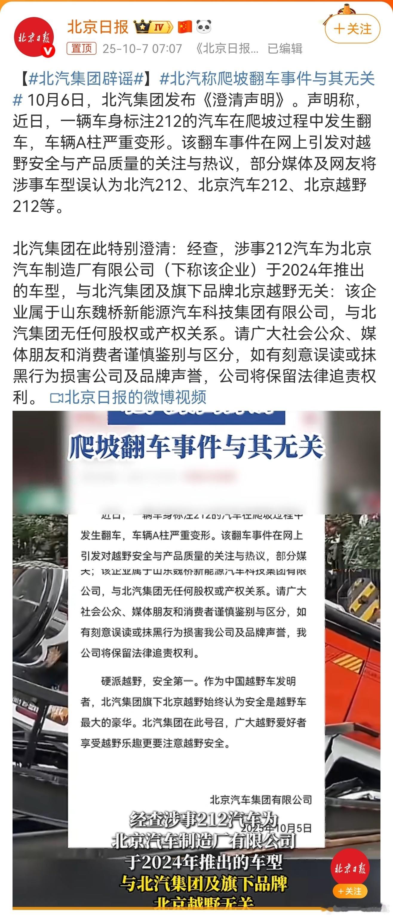 北汽集团辟谣北京汽车制造厂曾经是北汽集团的子公司,但是早就卖掉了,现在就是一家民企,跟现在的北汽集团毫无关系。因为名字有点像,有时候就会被误会[笑cry]北汽称爬坡翻车事件与其无关