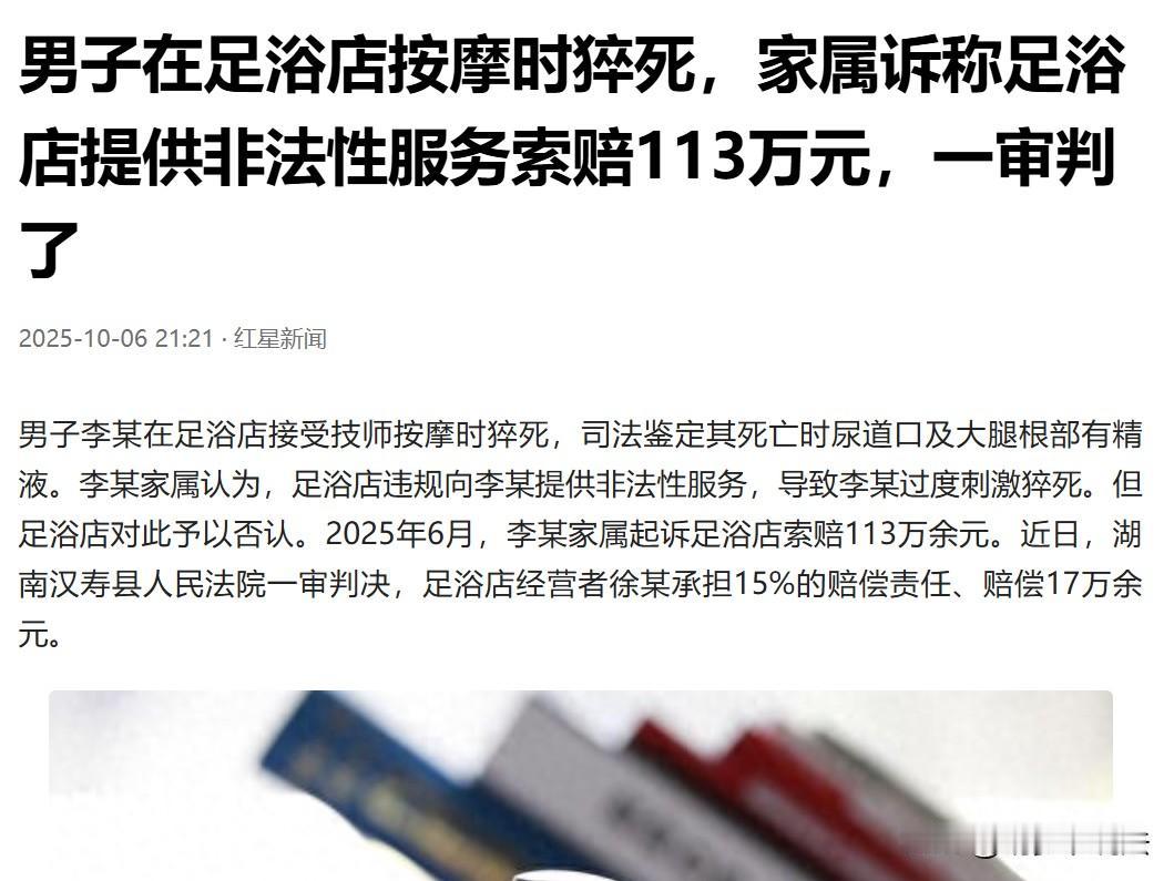 湖南汉寿,男子凌晨来到足浴店,找了一位漂亮的女技师,让她帮忙按一下摩,结果男子猝死了,家属得知后,根据男子大腿根部有不明液体,认定足浴店提供了非法服务,于是向足浴店索赔113万。 2025年3月19日,凌晨0点了,李某在家躺在床上,是翻来覆去地睡不着,他感到浑身不舒服,这么一折腾,他完全没有了睡意。 他起床看了一下窗外,夜间的街道依然灯光如昼,他穿好衣服,决定去足浴店。 他进店之后,有一个员工招待了他,还叫来了四五个技师,任由李某挑选。 李某比较挑剔,他就喜欢有芊芊玉手的,看起来还年轻漂亮的女技师,他看着有一名女技师长得也温柔体贴,于是就选定了68号。 他一看这位女技师的号,就更喜欢了,这个号寓意实在是好,又顺又能发,还能让他舒服开心。 可就是这个决定,李某躺在床上,发生了危险,却没有被发现,错过了被抢救的时机。 68号确实是一个不错的女技师,她为李某提供了服务,李某是躺在床上是一个不吱声。 68号就觉得奇怪了,她给这个人按了一个多小时了,这个人却不说话,好像还睡着了,她很少遇到这样的顾客。 一直到快要结束的时候,这个李某都没说话,似乎就是睡着了,后来68号觉得不对劲,就叫了几声,结果发现李某没有反应。 68号慌了,她觉得李某可能出事儿了,就赶紧叫来前台的工作人员,让他去看一下。 前台工作人员去看了一下,果然发现这个李某身体不对劲,叫也叫不应,就赶紧打了救护车电话。 等医护人员赶来,抢救了10来分钟,这个李某都没有苏醒过来,他们又把李某运往医院,可李某还是为此失去了生命,医生诊断为李某猝死了。 好端端的李某,无缘无故在足浴店,就这样猝死了,家属知道之后是完全不能接受。 毕竟李某上有老下有小,一家人还等着他养家糊口,一个家的顶梁柱,就这样倒下去了,他们自然要追究足浴店的责任。 他们觉得如果没有足浴店的存在,李某也不会半夜出去按什么摩,他也不会兴奋过度,也不会就突然猝死了。 更何况,他们觉得这个足浴店就不是什么正规的,因为在检查的过程,李某的大腿根部有不明液体,显然就是李某被提供非法服务了,这才过于刺激,引发了自己身上的疾病。 如果这个足浴店不提供这些服务,那么这个李某就不会来这里,李某也不至于为丢了生命。 因此发生这样的事情,李某的家属就怪足浴店提供了非法服务,因此他们向足浴店索赔113万。 足浴店当然不愿意赔了,他觉得李某是因为自身的疾病而突发情况离世的,他明知道自己身体有问题,还深夜来这里,也知道自己即将面对的是什么,是他没有对自己负责。 对此李某的家属就说了,在这之前,该店也没有进行安全提示,在李某发生突发情况之后,也没有及时进行救助,所以才会导致李某失去了生命的。 那么足浴店是否需要赔偿呢? 1、 李某去按一下摩,他进店之后,该店就需要履行安全保障义务。 《民法典》第1198条规定:宾馆、商场、银行、车站、机场、体育场馆、娱乐场所等经营场所、公共场所的经营者、管理者或者群众性活动的组织者,未尽到安全保障义务,造成他人损害的,应当承担侵权责任。 如果该店确实没有进行安全提示,没有告诉李某身体上有哪些疾病是不可以进行按一下摩的,那么该店就要进行赔偿。 2、 该店要不要赔偿,则要看该店有没有过错,如果有过错就要赔偿。 《民法典》第1165条规定:行为人因过错侵害他人民事权益造成损害的,应当承担侵权责任。 在本案中,李某本身有过错,他应当了解自己的身体,不可熬夜,他还来足浴店,所以他自己应当承担大部分的责任,足浴店如果没有尽到安全保障义务,他们也应当承担一部分的责任。 3、法院经过审理认为,该店确实没有进行安全提示,并且李某有异常之后,工作人员也没有及时发现,及时救助导致意外发生。因此足浴店需要承担15%的责任,最终要赔偿17万余元。 那么,你认为足浴店需要赔偿吗?来源:红星新闻 2025.10.6