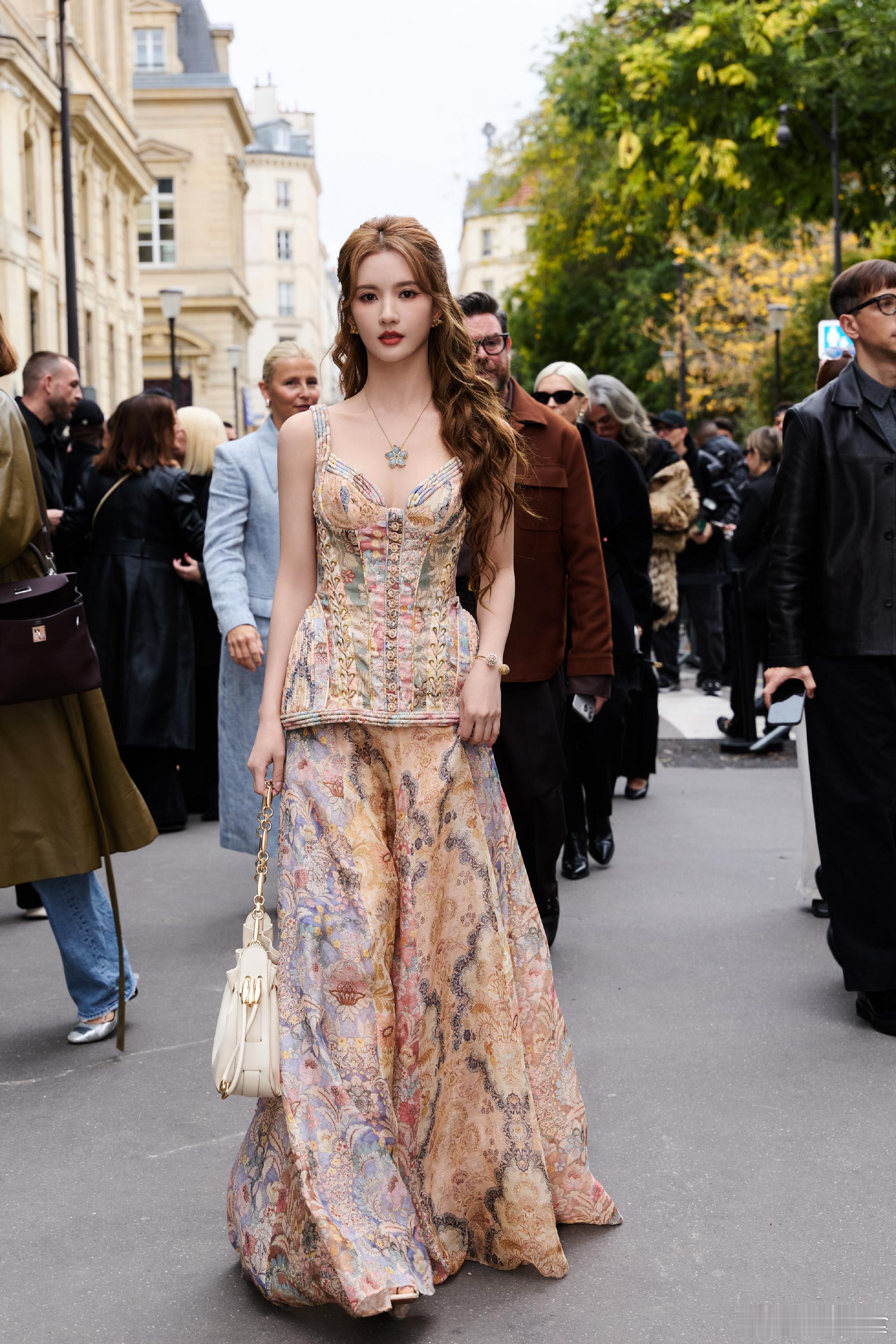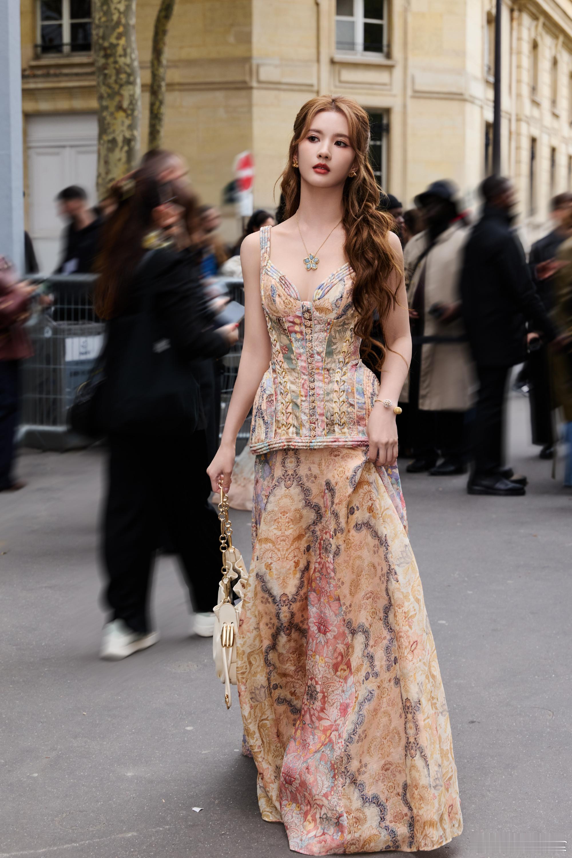 刘些宁秋日油画里走出的美人哇塞!刘些宁在巴黎时装周简直美成一幅画,印花复古长裙随