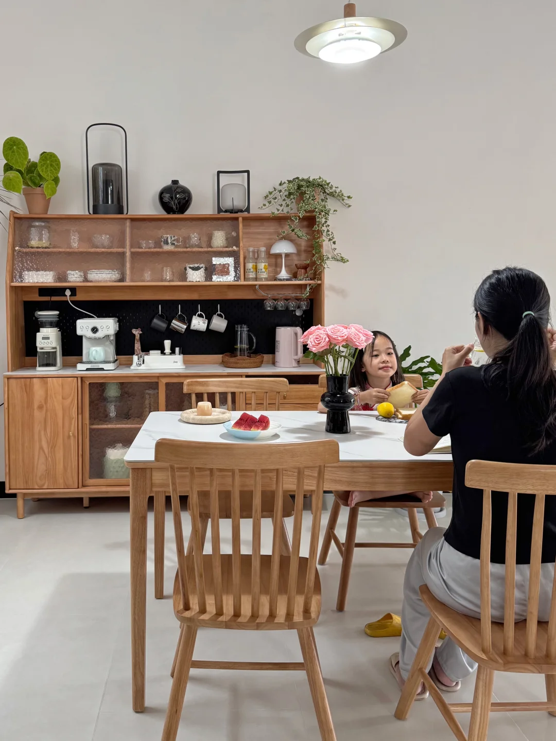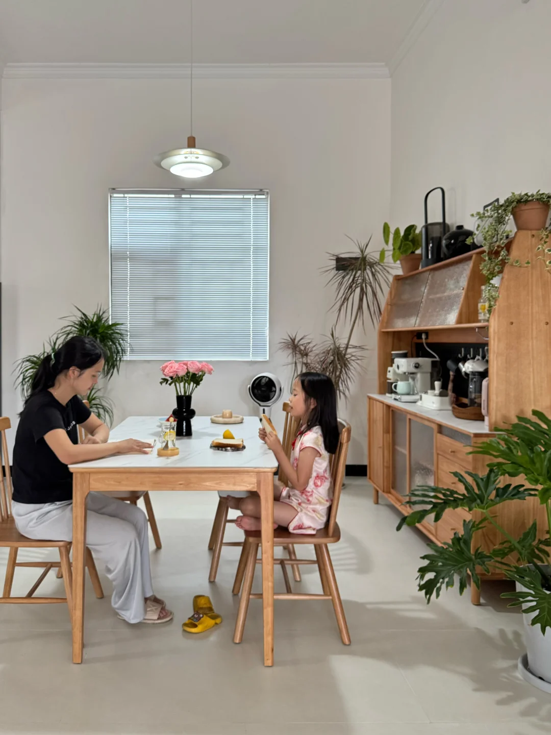 一开始纠结实木台面,但看到邻居家的烫痕+酱油渍,果断听了爸妈的选了林氏家居岩板餐桌。