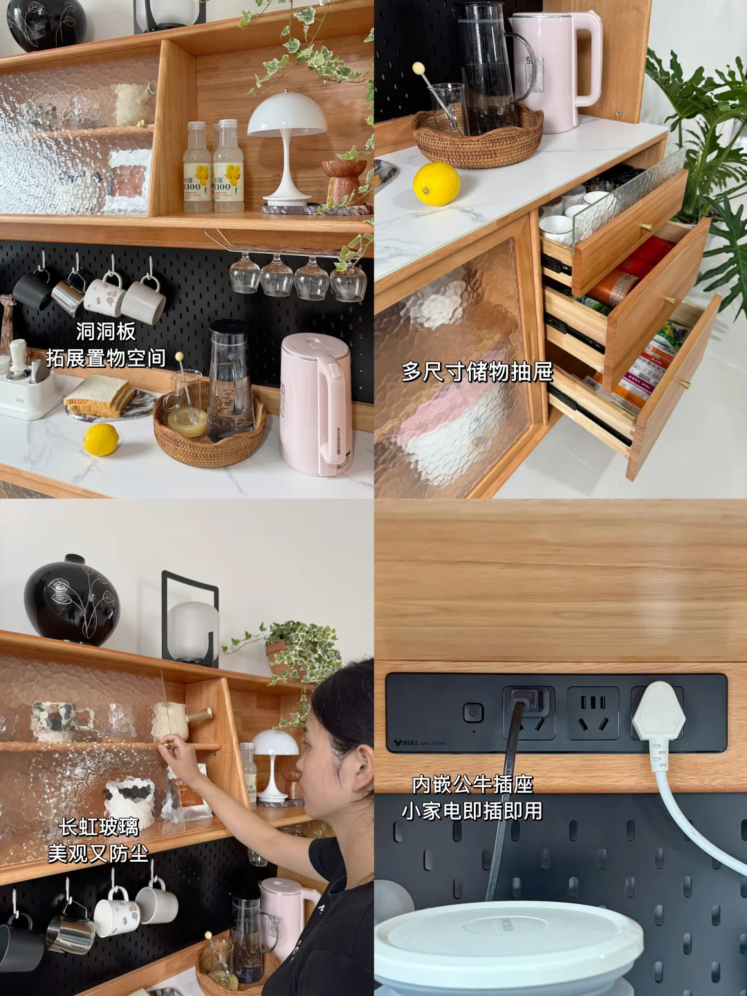 中部岩板茶吧:洞洞板拓展了收纳的方式,我布置成了我的咖啡制作区。岩板桌面很方便清洁,夏日切个柠檬,泡个柠檬水,做个三文治简餐,餐具、工具等随手可拿很是方便,简直就是第二个厨房;