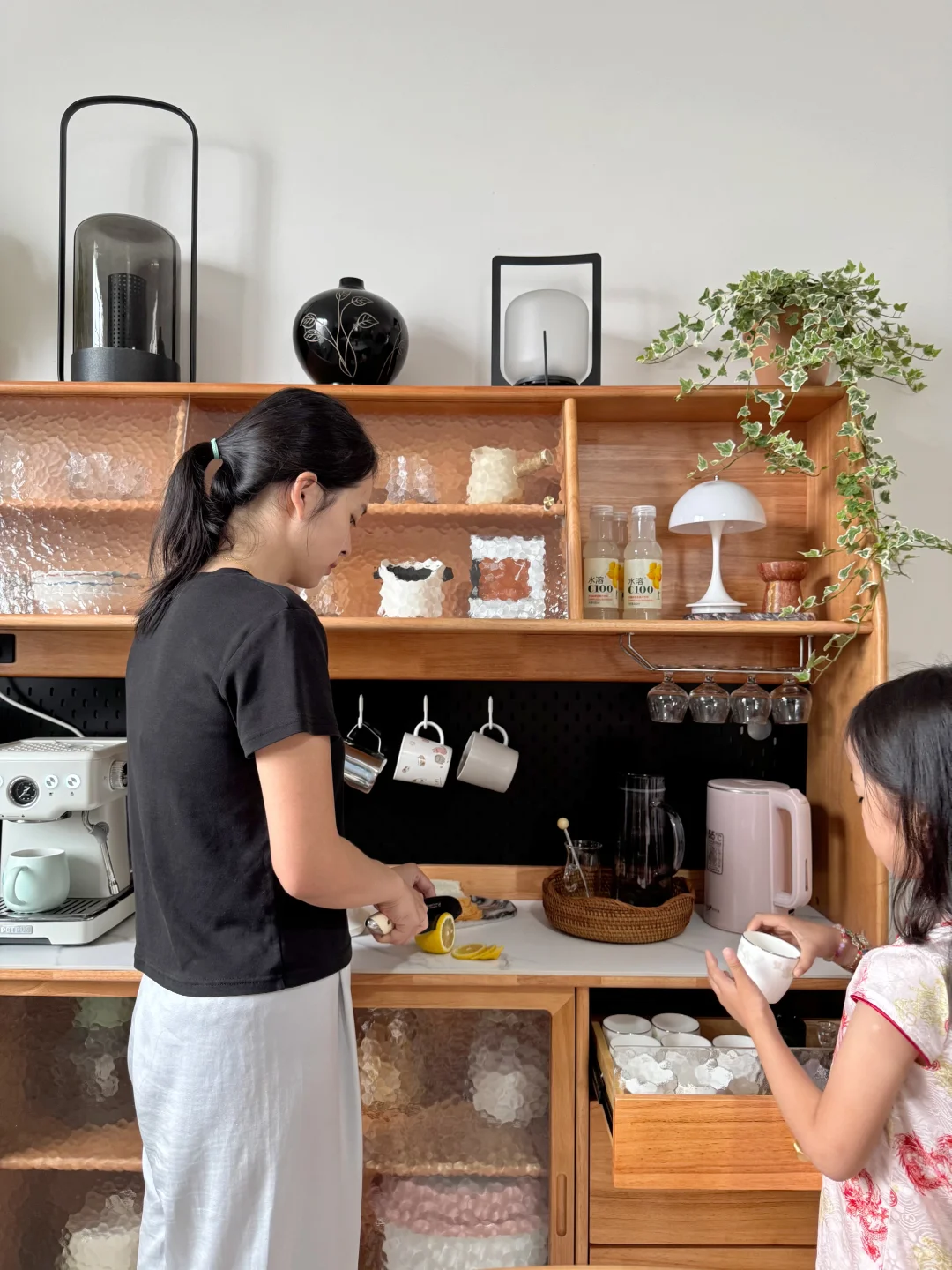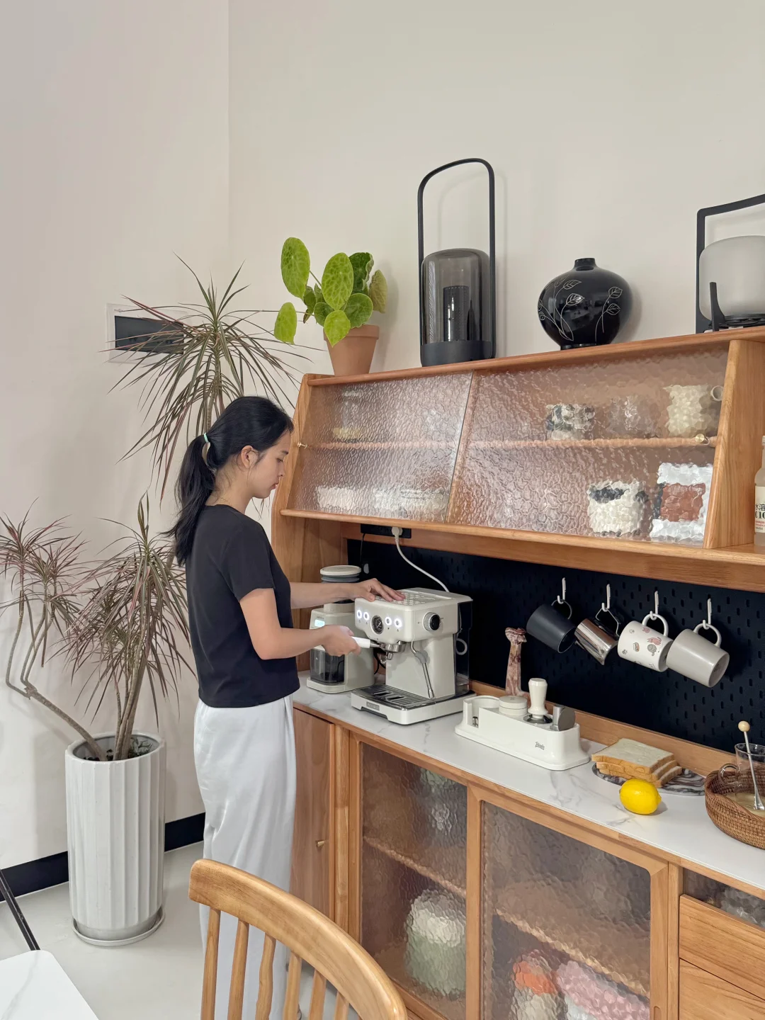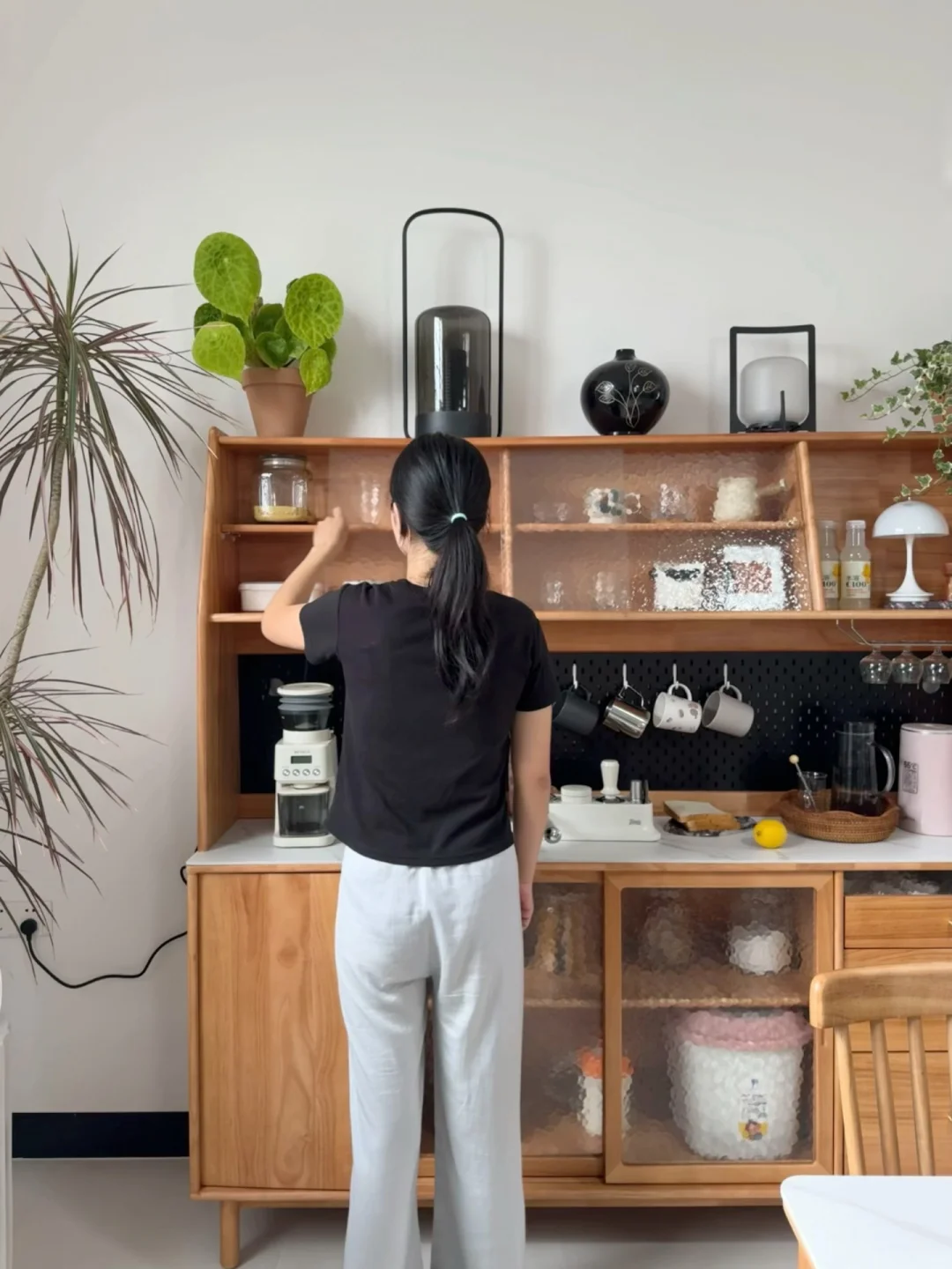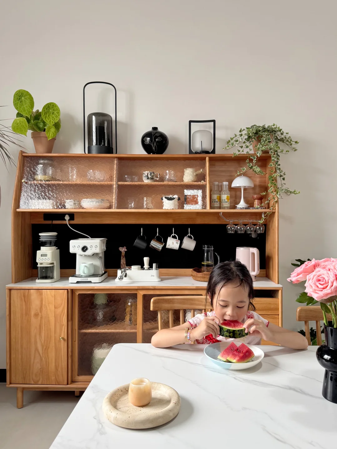 餐边柜收纳力爆表,以前杂物堆满桌,现在台面只放咖啡机和绿植,治愈了我的强迫症。
