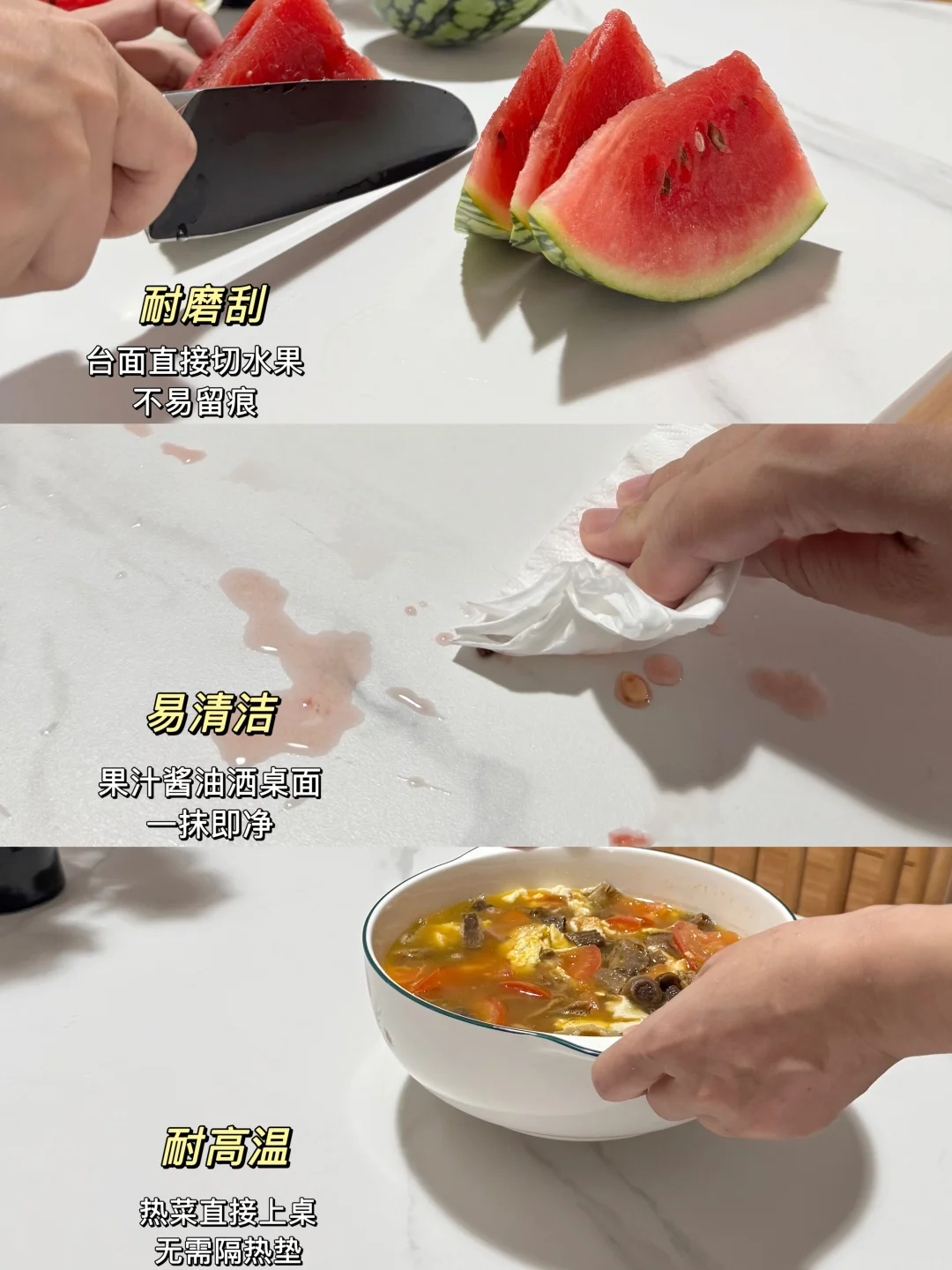 热汤锅直接放,菜汁、酱油、小孩乱涂乱画,抹布一擦即净,清洁0压力。仿大理石鱼肚白的纹路还耐磨耐刮,炎炎夏日,在餐桌面直接切西瓜等水果毫无压力。吃完饭湿抹布转一圈就搞定,省下时间遛娃看晚霞。