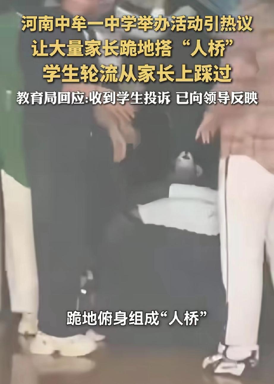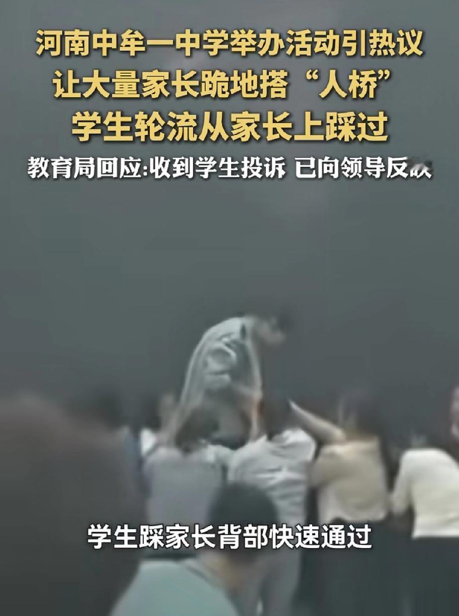这所学校的做法是否合适 近日河南中牟新区某高级中学的一场“感恩教育”活动引发大家的热议。有人认为学校的初衷是好的,是想让学生体会父母的不容易,特别是常年累月的托举,让父母一次次的弯腰;也有人认为,教育归教育,有必要以牺牲父母的尊严来维护这种亲子关系吗? 活动中,学校要求父母双膝跪地,弓背搭成“人桥”,学生则蒙着眼睛从父母身上踩过去。在活动现场有学生踩过去后,发现自己踩的是自己的父母,当场就哭的崩溃。有网友说,从这个活动现场的安排,可以筛选出哪些是配合的家长,哪些是“刺头”也就是不配合学校的活动的。我想活动的的意义和出发点肯定是好的,想让孩子体会到父母的不易,父母“弯腰”工作了一辈子,也没有任何怨言,还在尽力托举你们,让孩子知道父母的心酸无不容易。大家觉得有争议的地方,应该不是活动的出发点,而是活动的方式是否得当。 有学生在网络上上传这段视频后,在网上也是引起了热议。甚至有学生当场给教育局打电话,询问此举是否合适。校方估计扛不住舆论的压力了,在今天早上通过微信公众号进行发布情况。并向家长说明活动的细节确实考虑不周,造成了一些不好的影响,引发的家长和学校之间的误解,对此表示歉意。并表示今后学校的活动会注意方式方法。 有学生向教育局反馈,教育局给出的回复是该活动是两个班级自行组织,并未向学校报备,目前正在进一步的调查中。 每个孩子都是家庭的希望,作为父母肯定会尽力托举。同样只要是学校的工作,相信父母也会支持。但这个活动确实方式有些不妥,不恰当。从孩子踩背过去时,把眼布揭开发现是自己父母时,情绪就崩溃。说明孩子打心底也是不认可这种方式,所以作为学校在举办活动时还是应该要以人权为前提,多与家长进行沟通,看有多少家长支持! 你们认为这个活动的方式有问题吗? 郑州学校事件 中牟中学 中牟学校搬运 郑州示范性高中 郑州感恩教育 中牟高中 中牟县求实中学