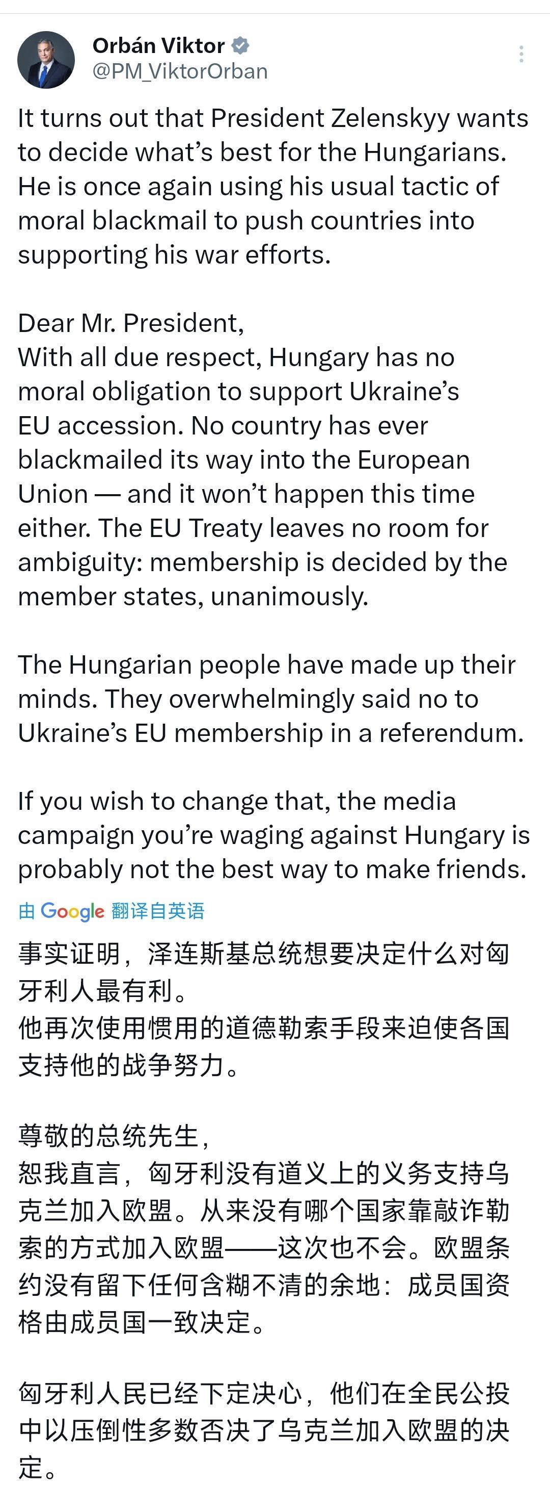 匈牙利总理欧尔班今天(北京时间10月7日)对泽连斯基强硬喊话:“事实证明,泽连斯基总统想要决定什么对匈牙利人最有利。他再次使用惯用的道德勒索手段来迫使各国支持他的战争努力。 尊敬的总统先生,恕我直言,匈牙利没有道义上的义务支持乌克兰加入欧盟。从来没有哪个国家靠敲诈勒索的方式加入欧盟,这次也不会。欧盟条约没有留下任何含糊不清的余地:成员国资格由成员国一致决定。 匈牙利人民已经下定决心,他们在全民公投中以压倒性多数否决了乌克兰加入欧盟的决定。如果你想改变这种状况,你针对匈牙利发起的媒体攻势可能不是交朋友的最佳方式。” [机智]评几句:欧尔班的强硬态度由来已久,俄乌冲突以来,匈牙利多次批评乌克兰用无人机袭击匈牙利从俄罗斯获取能源的管道,还对乌克兰境内匈牙利族少数民族权利保障问题表示担忧。此次欧尔班的喊话,不仅是对泽连斯基个人的回应,更是匈牙利在俄乌冲突及乌克兰加入欧盟等问题上坚定立场的体现。 欧尔班此次强硬表态,不仅是对泽连斯基的回应,更是对欧盟一体化进程的一次“刹车”。他强调欧盟入盟需“一致同意”,这实际上是在提醒,只要匈牙利不同意,乌克兰的入盟之路就难有进展。同时,他将自己的立场与“全民公投”挂钩,试图用民意来为自己的否决权背书。这一举动也凸显了欧盟内部的裂痕:一边是波罗的海等国对乌克兰的坚定支持,另一边则是匈牙利、斯洛伐克等国更关注自身能源安全和经济成本。在这种情况下,乌克兰若想推动入盟,可能需要在少数民族权利等问题上对匈牙利作出更多让步,以换取其态度软化。