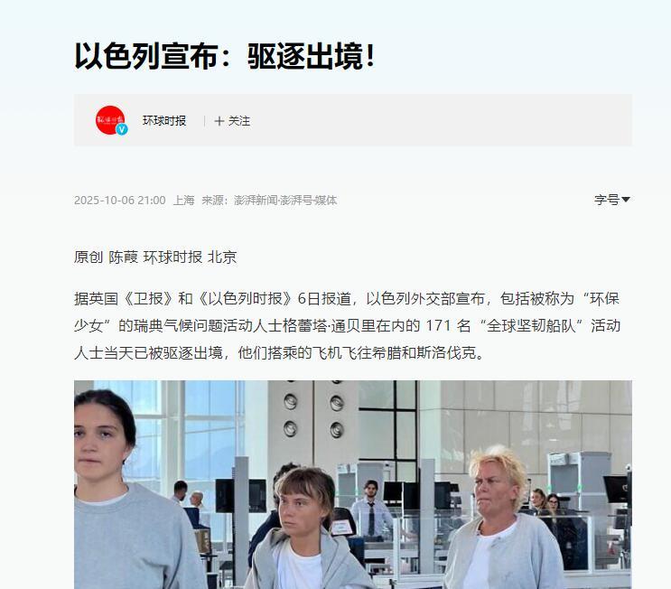 以色列外交部透露消息:“环保少女” 通贝里以及另外 170 名活动人士,已经遭到驱逐,离开了以色列境内。以色列说这是“依法办事”,可明眼人都看出来不对劲,这事里的猫腻,比他们说的“合法”多了去了。 先说说最扯的:以色列一口咬定“没虐待任何人”,还说通贝里“自己不想走,故意拖延”。 但首批被放去土耳其的人,一落地就哭着说实情:有人亲眼看见士兵揪着通贝里头发拖,逼她爬、逼她亲以色列国旗。 瑞典使馆去探视,也记录了她被关在满是臭虫的牢房里,每天就一碗稀粥、半瓶水,人都脱水了。 更讽刺的是,以色列的安全部长跑去监狱视察,还嘴硬说“就该把他们当恐怖分子对待”,这话说出来,再看他们“保障人权”的鬼话,谁信啊? 通贝里他们那船队,装的都是奶粉、水设备这些救命的东西,又没带武器,就想送进去,结果在国际水域就被以色列的军舰拦了,合着送援助也成“错”了? 以色列说“防恐怖分子”,可扣的是婴儿尿布,虐的是和平人士,这哪是反恐,分明是怕外人看见加沙的惨样。 也不是没人管。欧洲好多地方都抗议了,意大利直接搞全国罢工,街上全是举着“救加沙”牌子的人。 土耳其那边,被放的人一讲遭遇,老百姓都气炸了。这些抗议不是瞎闹,是大家都看明白了:以色列这是仗着有权,连基本的人道都不管了。 现在通贝里是走了,但监狱里还有人在绝食,加沙的孩子还在等吃的。以色列能拦得住船队,能编瞎话否认虐待,可拦不住大家知道真相,也挡不住加沙人想活下去的劲儿。 这事从来不是“驱逐一个通贝里”那么简单,是230万加沙人该不该有活下去的权利,是个人都明白,靠封锁和暴力压人,再硬的拳头也压不住人心。 说到底,公道自在人心。就算以色列能把人赶走,能堵上一时的嘴,可加沙的苦难、他们做的那些事,早被记下来了。 正义可能会晚,但绝不会一直缺席,毕竟,谁也没法让一个想活下去的民族,永远屈着。