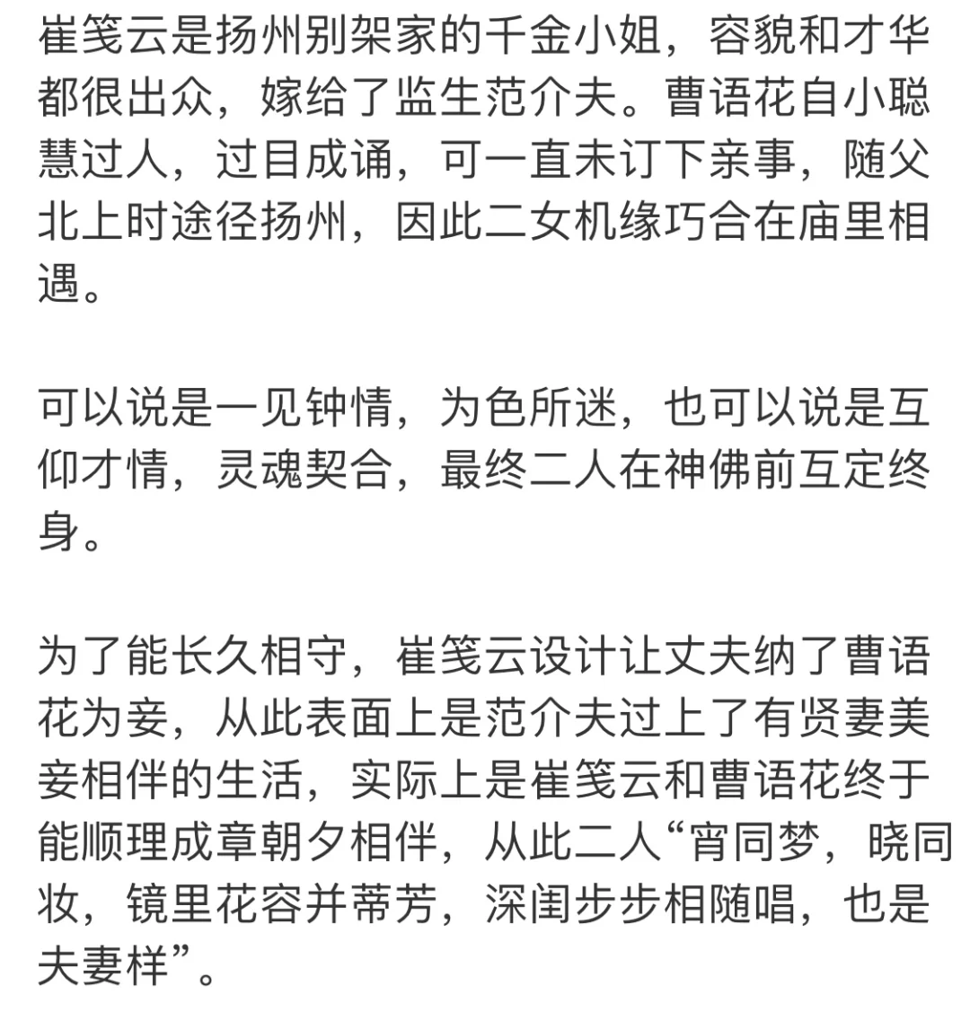 为了能长久相守,崔笺云设计让丈夫纳了曹语花为妾,从此表面上是范介夫过上了有贤妻美妾相伴的生活,实际上是崔笺云和曹语花终于能顺理成章朝夕相伴,从此二人“宵同梦,晓同妆,镜里花容并蒂芳,深闺步步相随唱,也是夫妻样”。