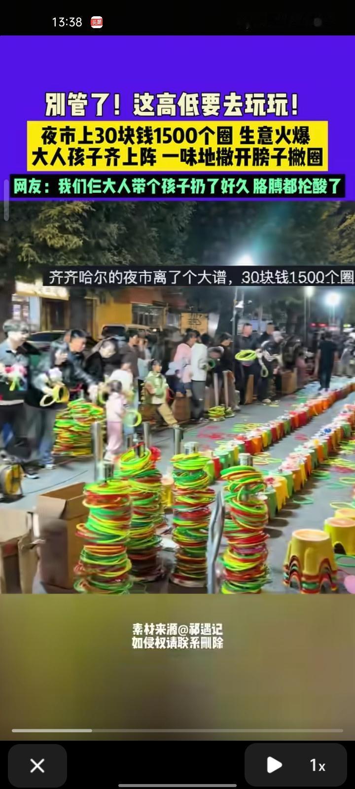 10月6日,黑龙江齐齐哈尔。真是离了个大谱,夜市上30元1500个圈,每人前面放了好几摞,大人小孩齐上阵,扔着扔着估计胳膊都抡酸了,老板捡圈也捡的快疯了