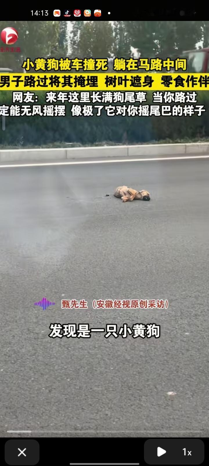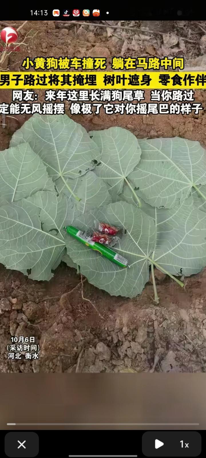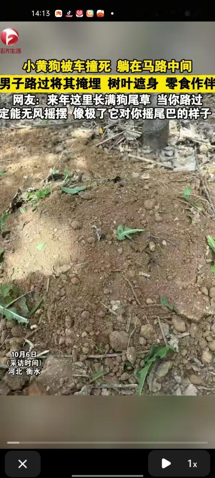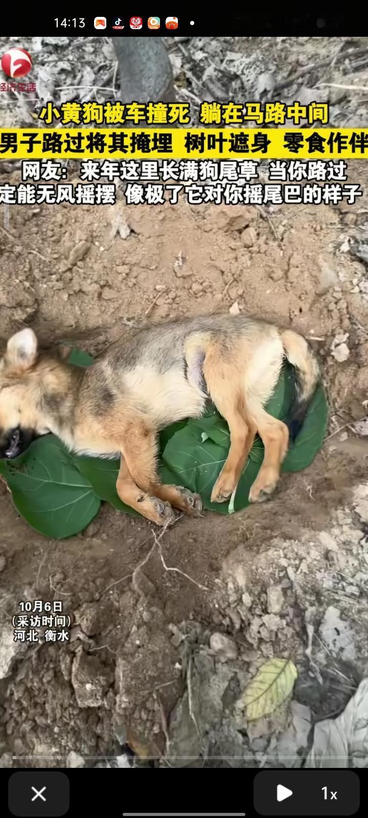 10月3日,河北衡水。网友发视频称,自己开车行驶途中看见一只狗被车撞死,躺在马路中间。随后,把小狗遗体搬到有草坪的地方,然后挖了坑把小狗放里面,用树叶覆盖,零食做伴,然后埋起来了。当事人还说,自己内心深处看不了这些小狗小猫暴尸街头,情况允许就会把它埋掉或者救起来。