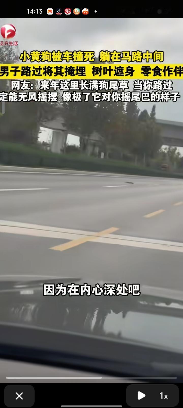 10月3日,河北衡水。网友发视频称,自己开车行驶途中看见一只狗被车撞死,躺在马路