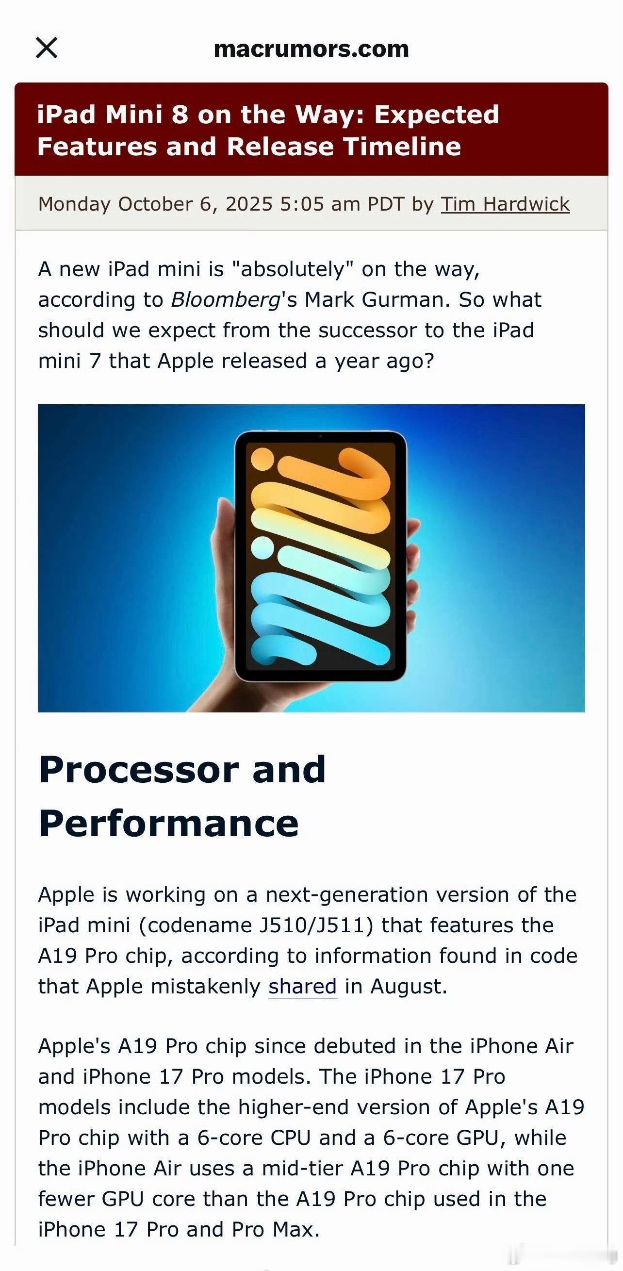 iPadmini8售价从目前的爆料来看iPad mini 8上高刷应该是很大几率,配置上A19 Pro阉割版+OLED屏幕,屏幕尺寸可能升级到8.7英寸(尺寸不变,屏占比提高),售价跟目前iPad mini 7持平。